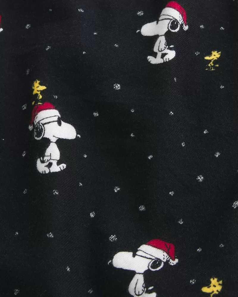 Super soft flannel pajama pants featuring official Peanuts-licensed Snoopy and Woodstock graphic patterns. Drawstring waist, pockets.