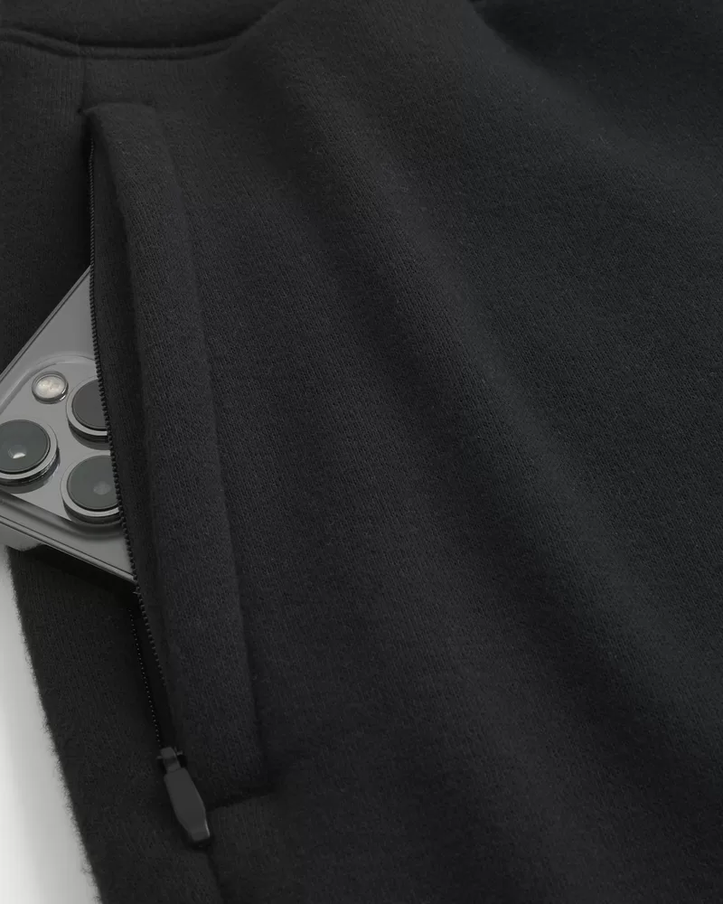 Super soft fleece shorts designed with an above-the-knee length and drawstring waist. Pockets, right zipper pocket, embroidered logo icon.