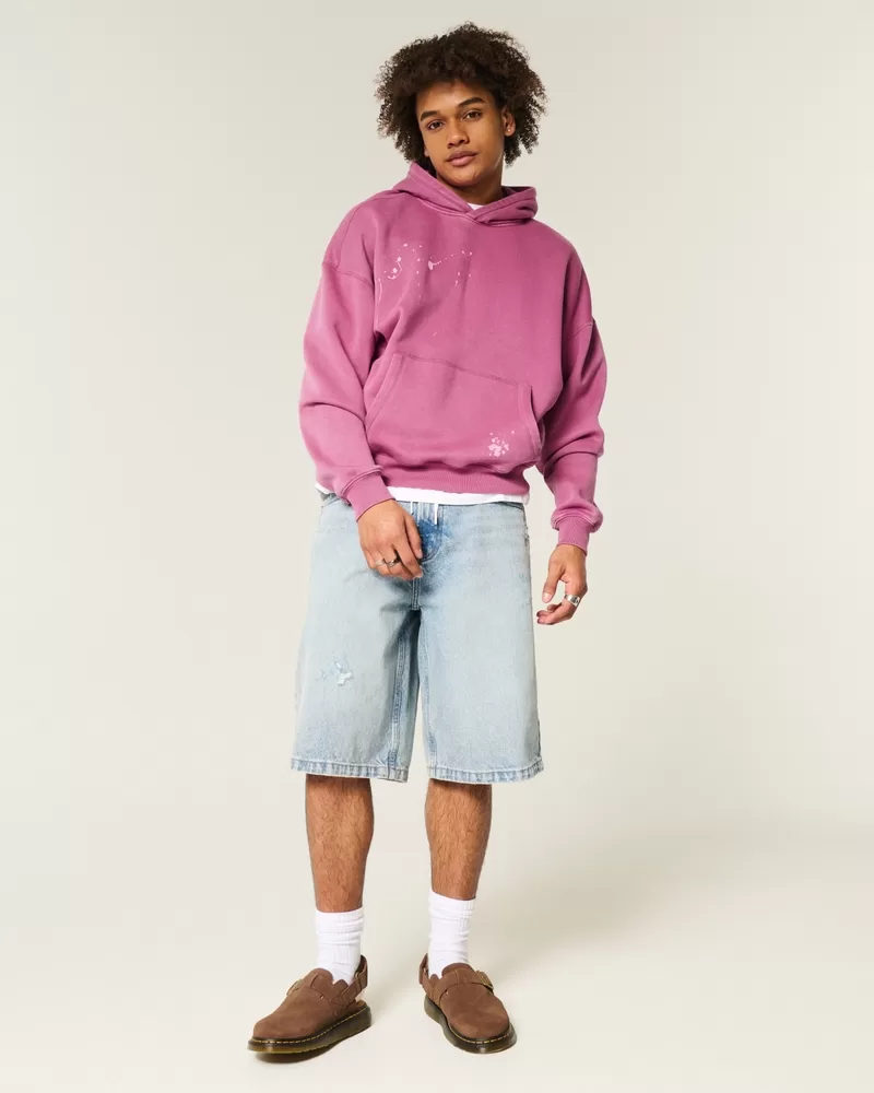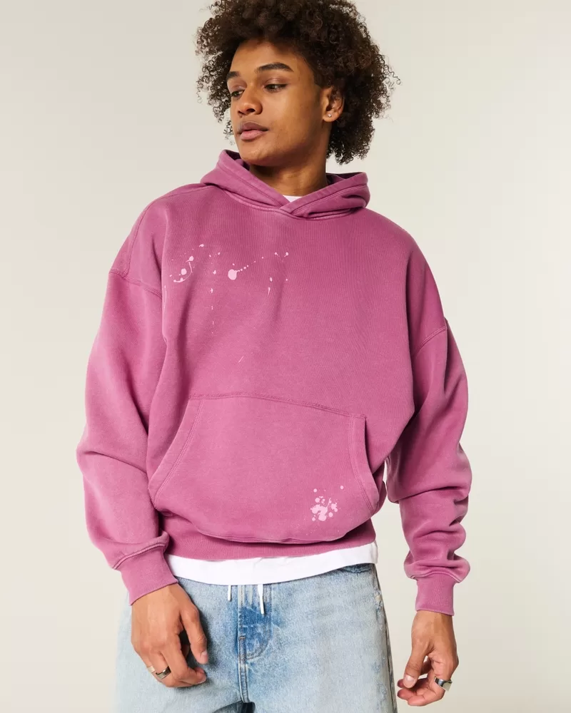 Made with super soft fleece fabric, this hoodie features paint splatter details and a washed look. Long sleeves, hood, front pouch pocket. Baggy Cinch Fit.