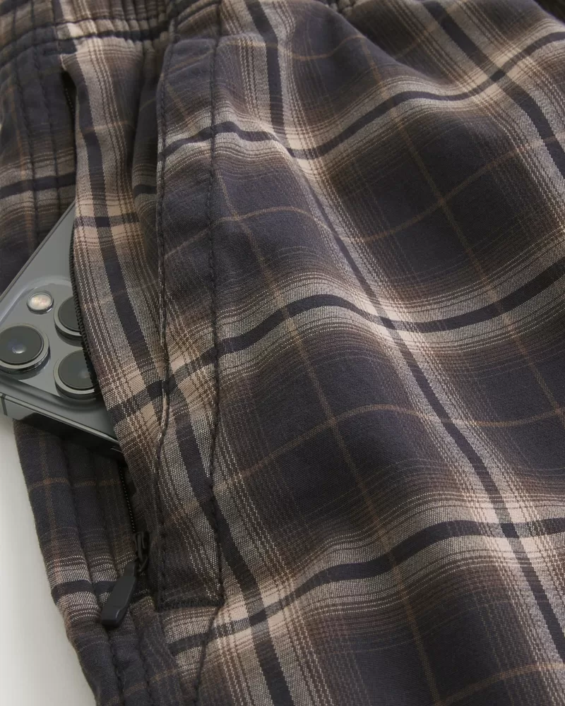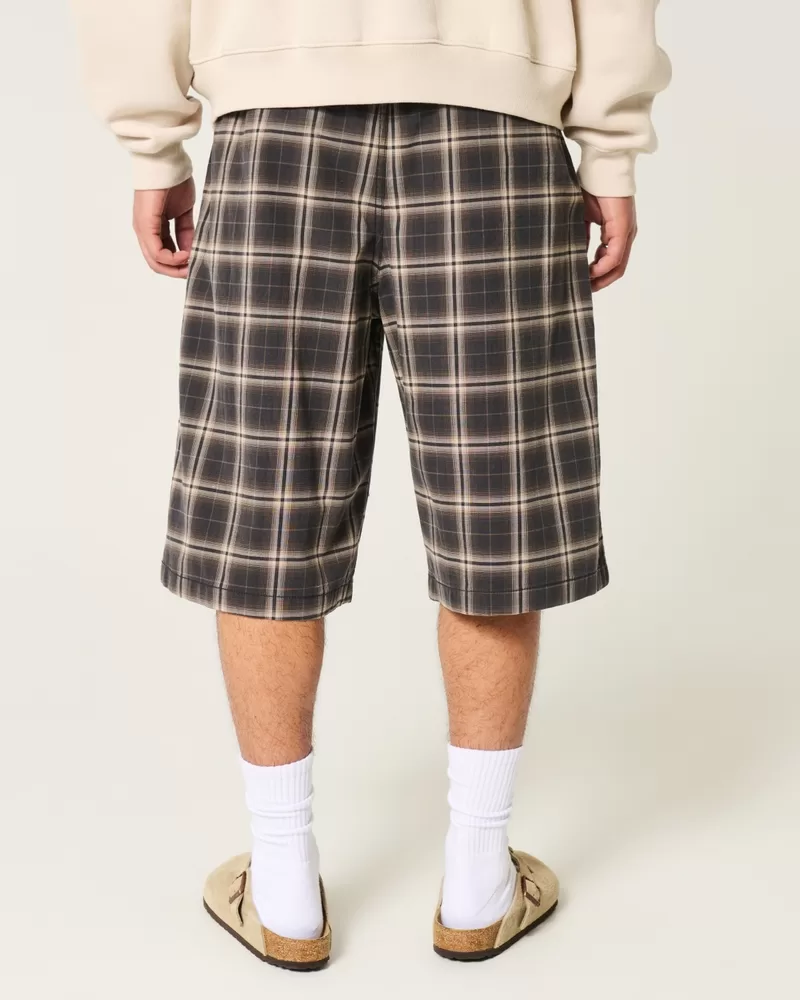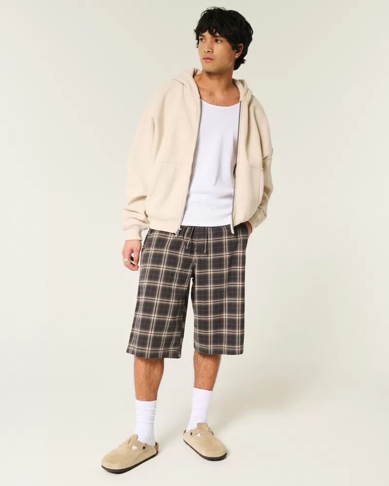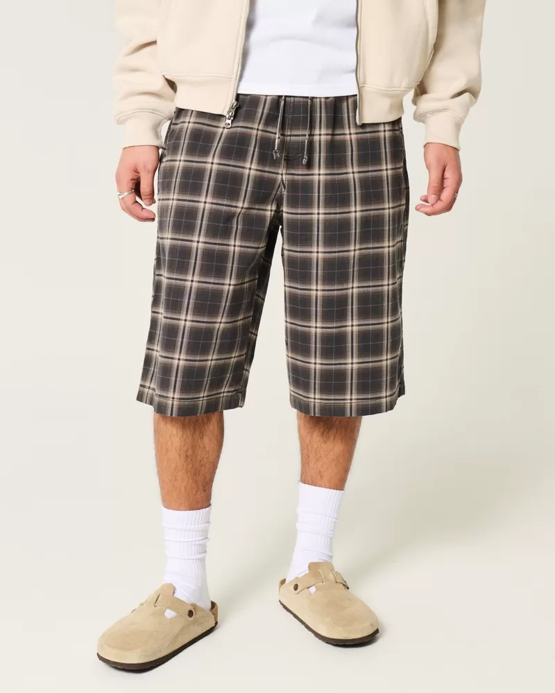 Comfortable shorts designed with a baggy fit and pull-on drawstring waist. Pockets, right zipper pocket. Below-the-knee length.