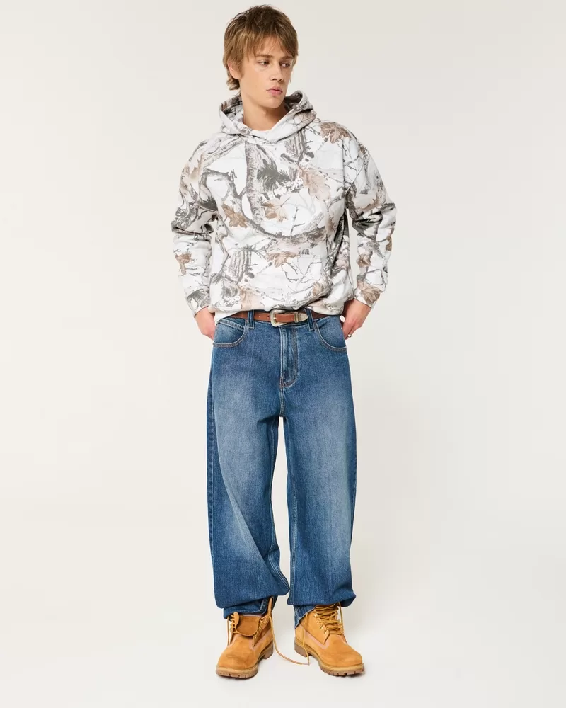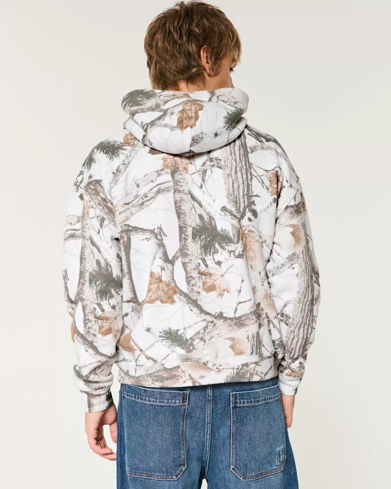 A super soft fleece hoodie featuring an all-over camo pattern. Hood, front pouch pocket, long sleeves. Boxy Fit.
