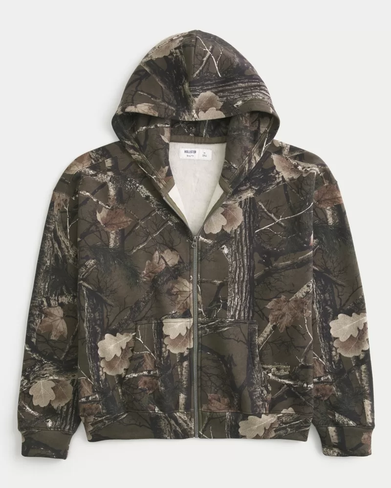 This super soft fleece hoodie features an all-over camo pattern and full zip-up closure. Hood, front pockets, long sleeves. Boxy Fit.