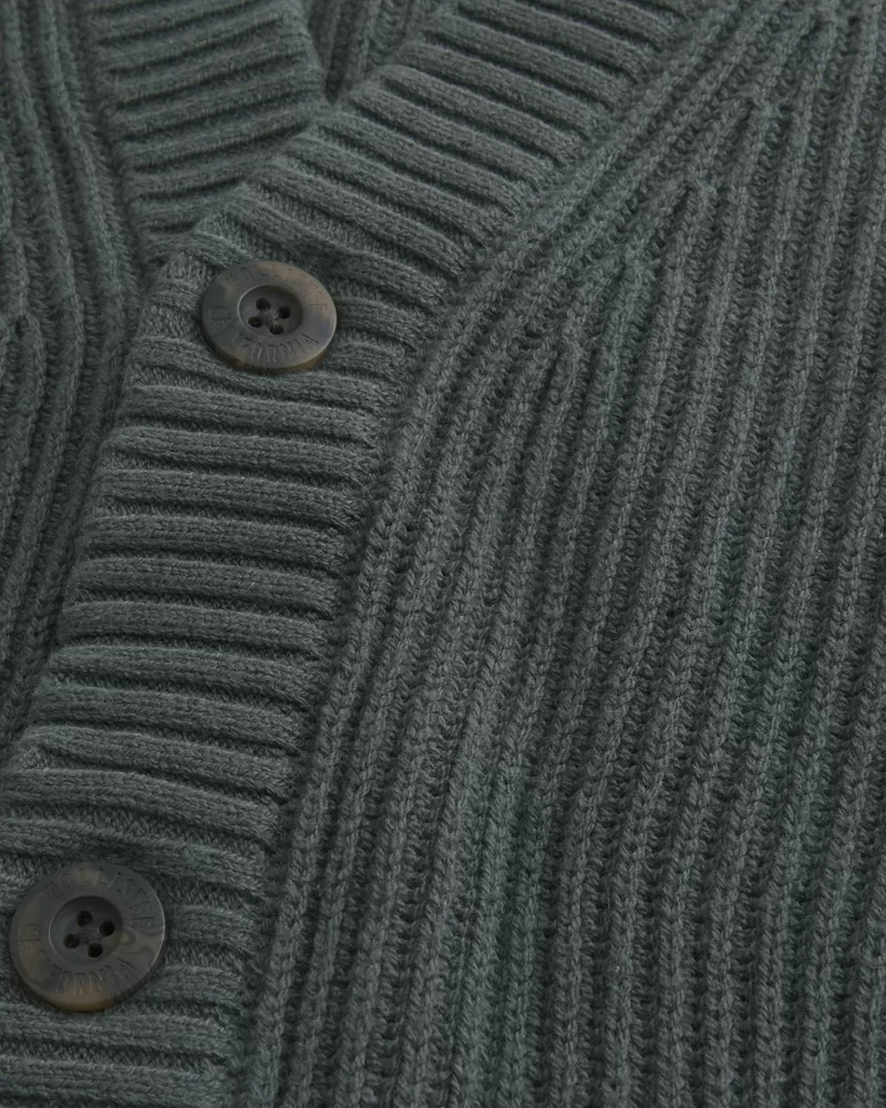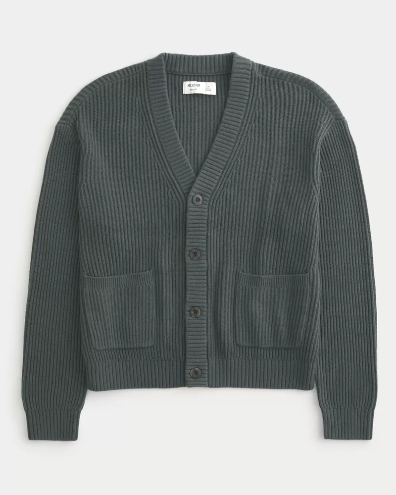 This super soft cardigan features classic ribbed texture, a v-neckline and button closure. Front pockets, long sleeves, ribbed trims. Boxy Fit.