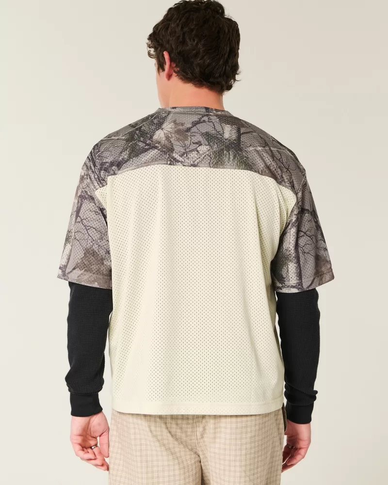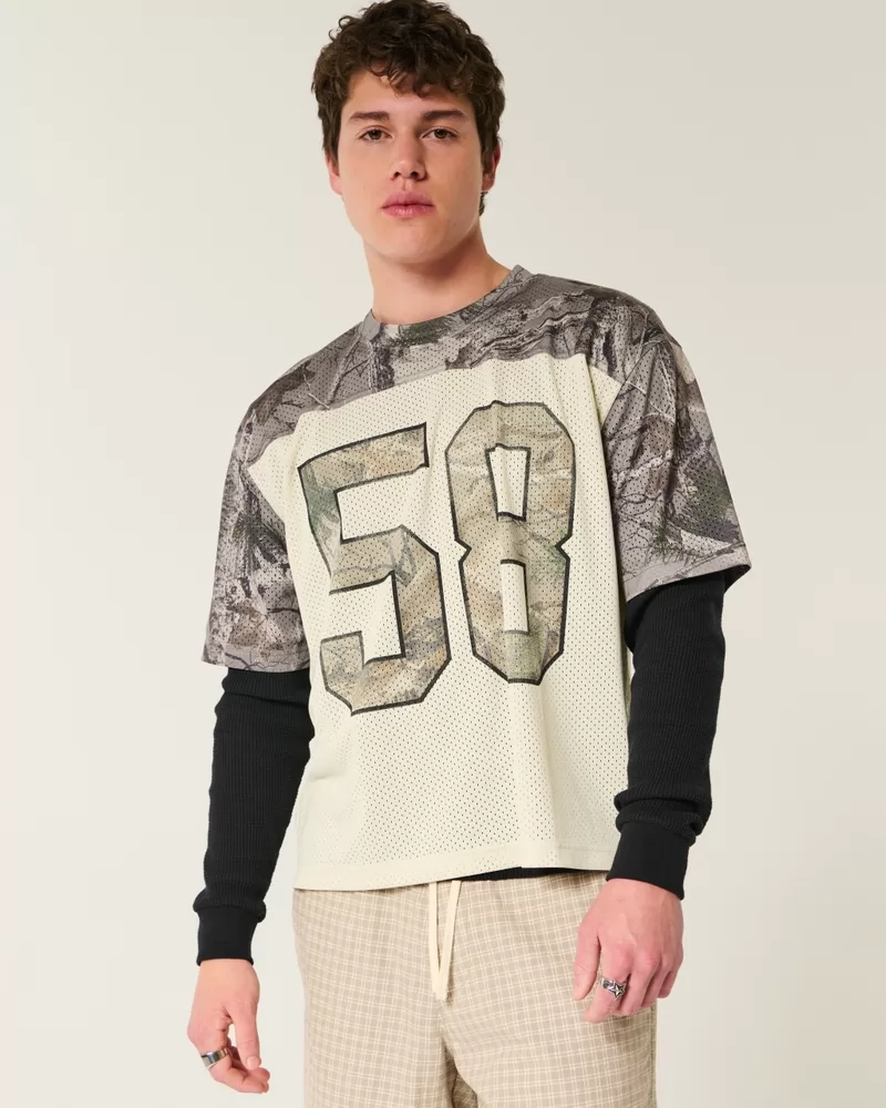A mesh jersey featuring printed graphics. Short sleeves, soft mesh fabric, v-neckline, camo pattern. Boxy Crop Fit. Imported.
