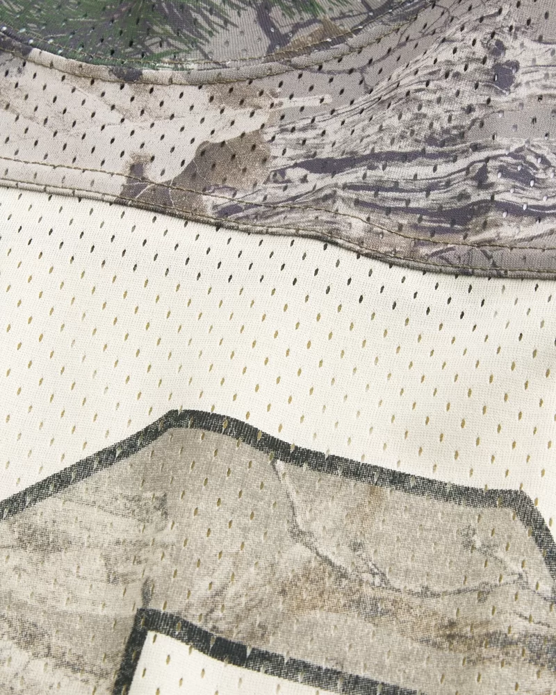 A mesh jersey featuring printed graphics. Short sleeves, soft mesh fabric, v-neckline, camo pattern. Boxy Crop Fit.