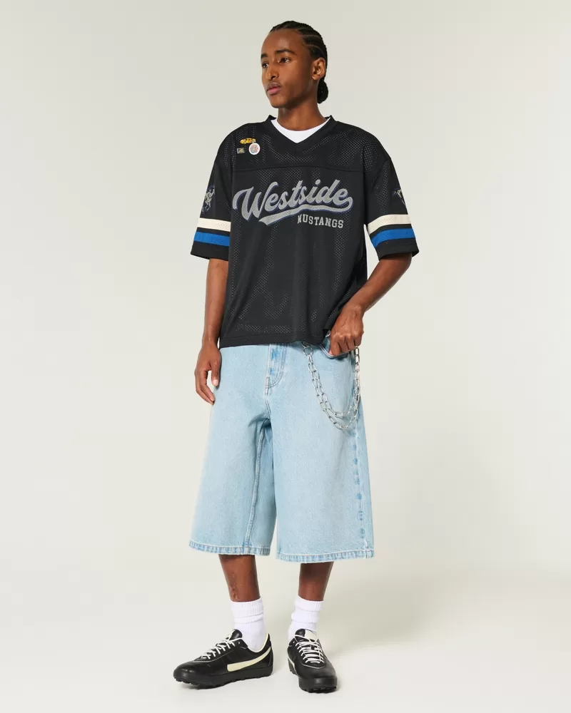 A classic jersey in soft mesh fabric, featuring Westside Mustangs print graphics at the front and a number graphic at the back. Short sleeves with print graphics, v-neckline. Boxy Crop Fit.
