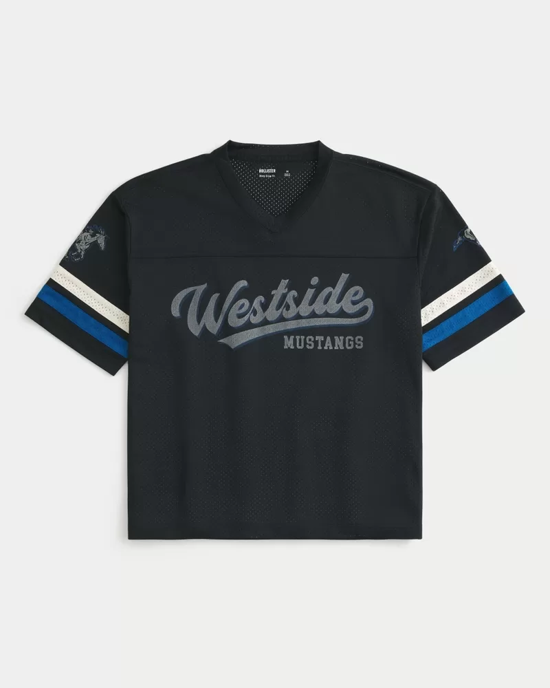 A classic jersey in soft mesh fabric, featuring Westside Mustangs print graphics at the front and a number graphic at the back. Short sleeves with print graphics, v-neckline. Boxy Crop Fit. Imported.