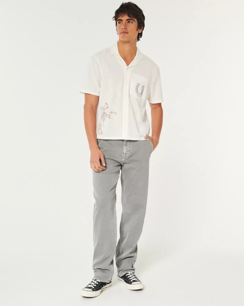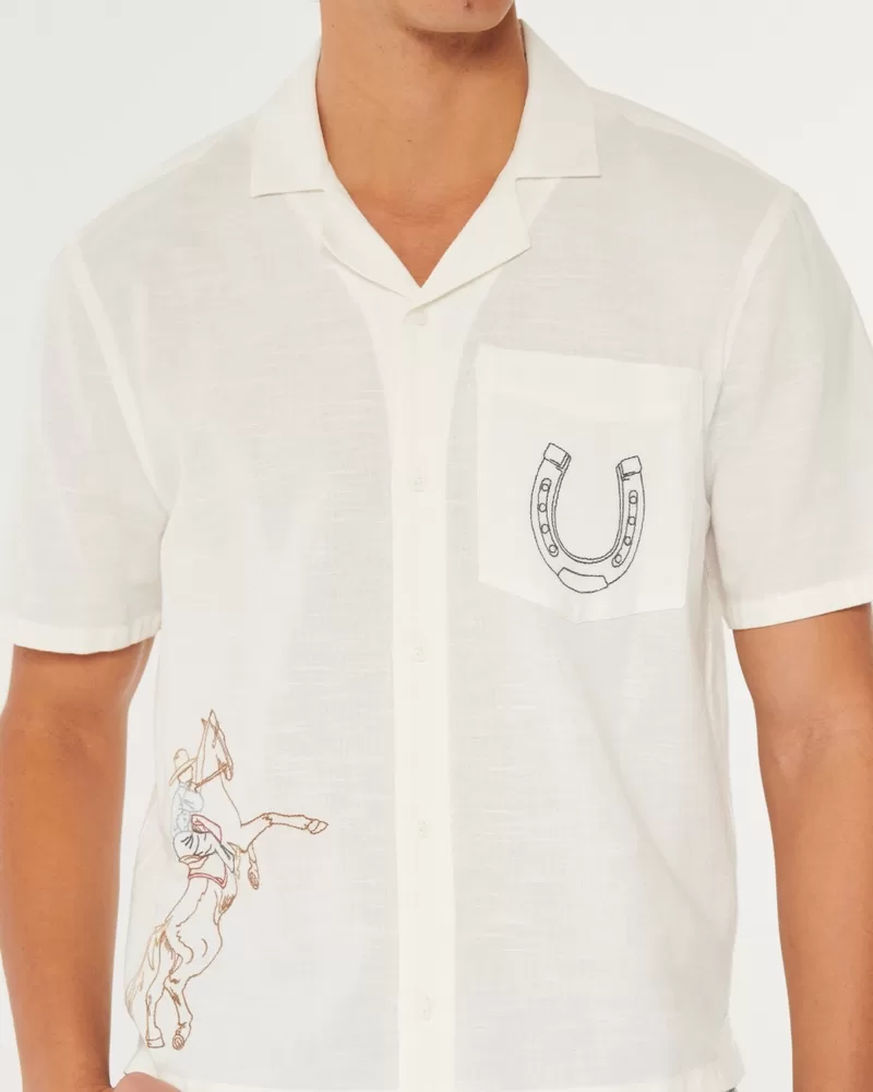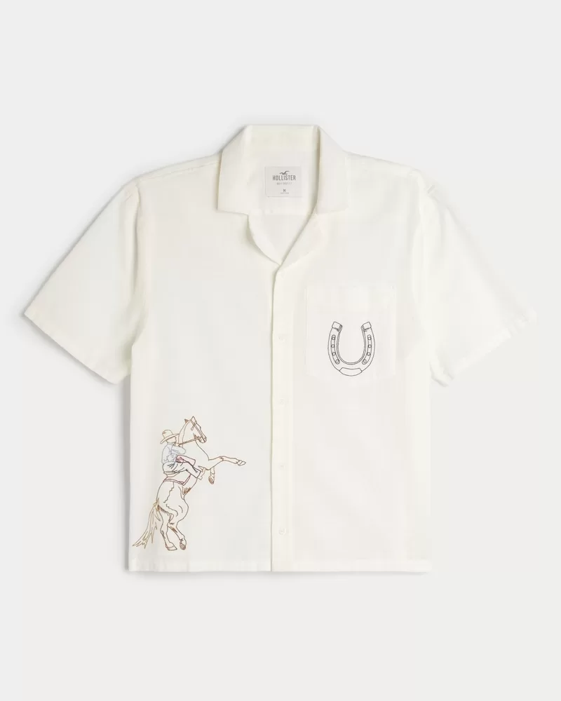 A classic workwear-style shirt featuring embroidered cowboy graphics. Collar, left chest pocket, short sleeves, cropped length. Boxy Fit. Imported.