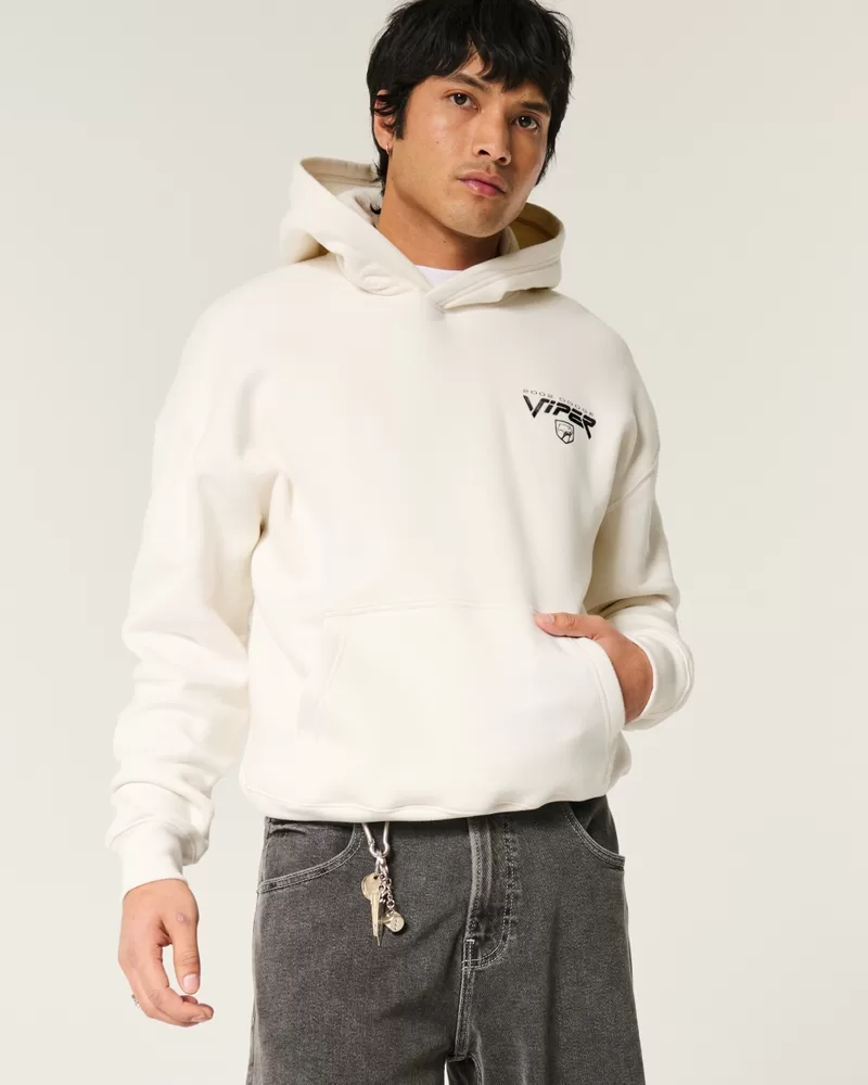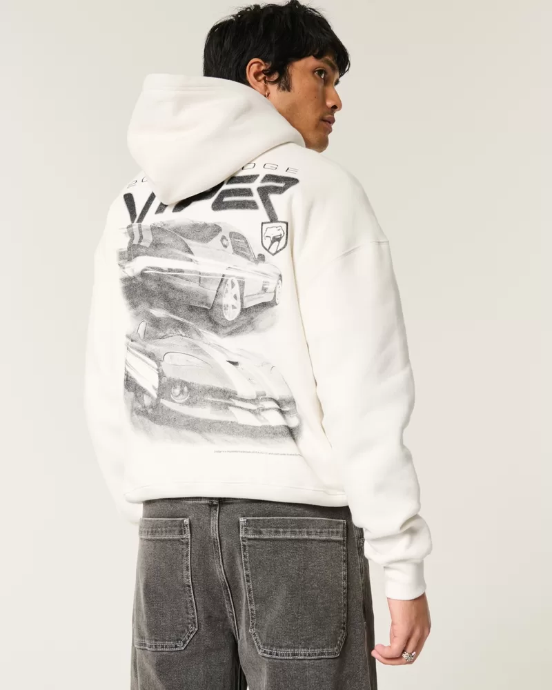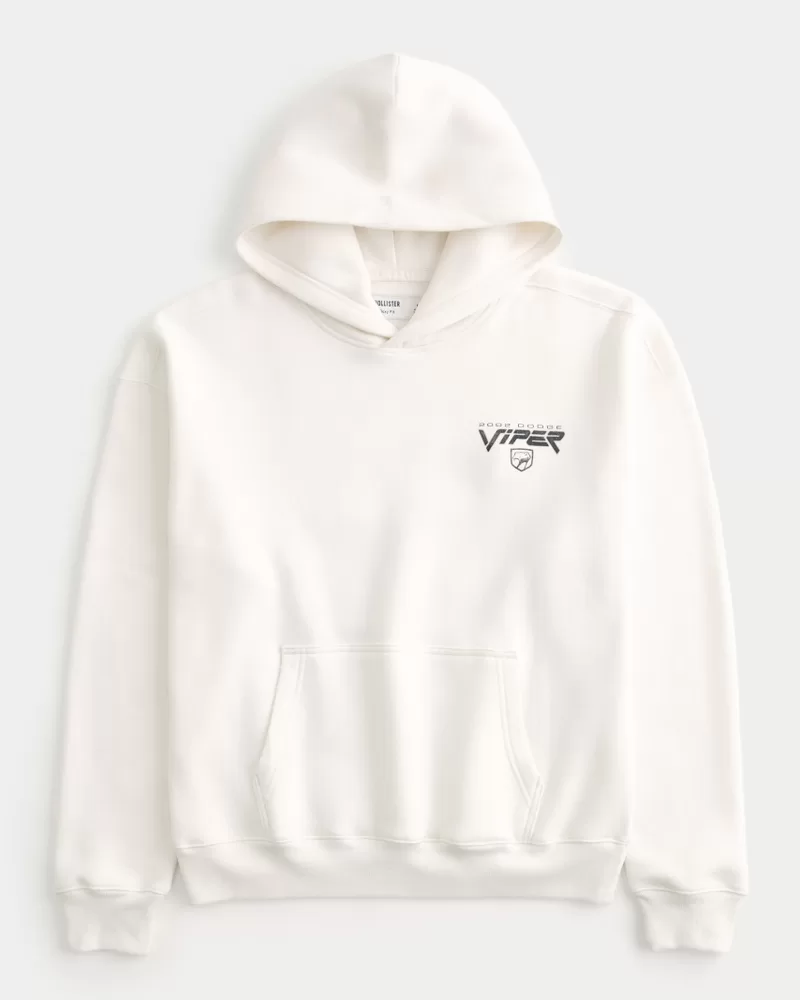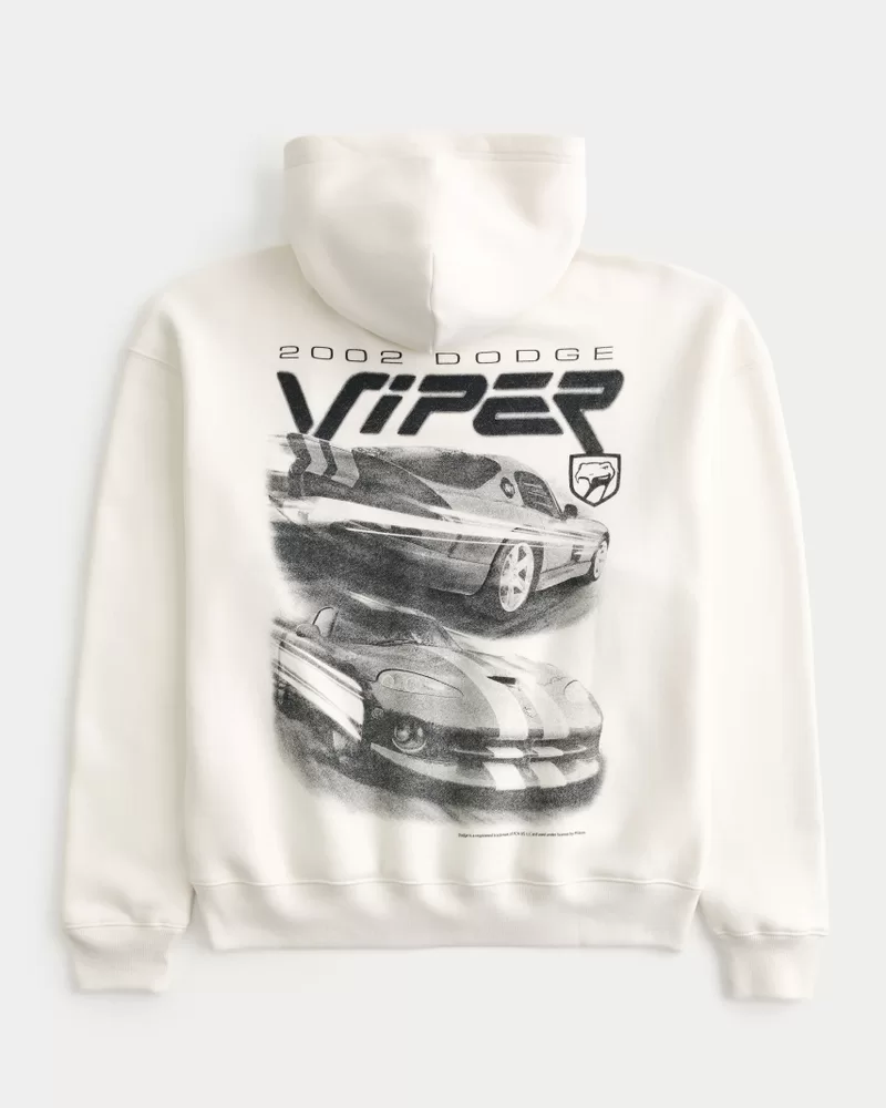 A super soft fleece hoodie featuring official licensed Dodge Viper print graphics at the left chest and back. Hood, front pouch pocket, long sleeves. Boxy Fit.