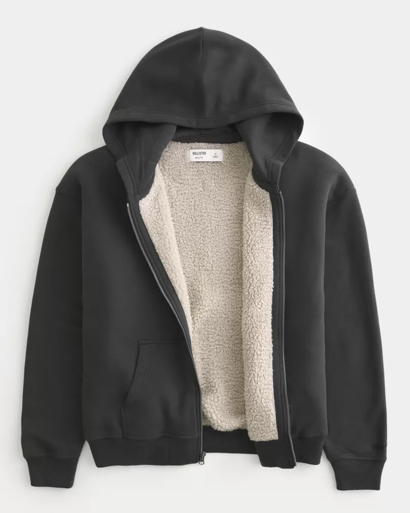 Ultra-comfortable and super soft, this hoodie features faux shearling lining and a full zip-up closure. Front pockets, long sleeves, hood. Boxy Fit.