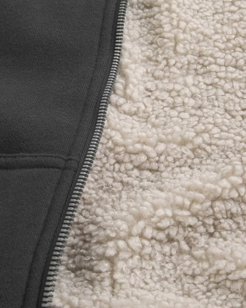 Boxy Faux Shearling-Lined Zip-Up Hoodie