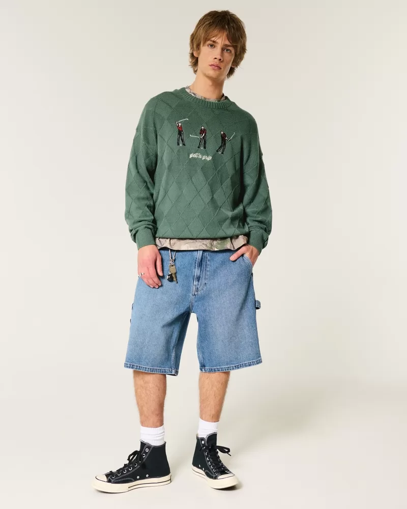 A super soft sweater featuring ‘get a grip’ statement graphic embroidery with golf swing details. Textured argyle pattern, crew neckline, long sleeves, ribbed trims. Boxy Fit.