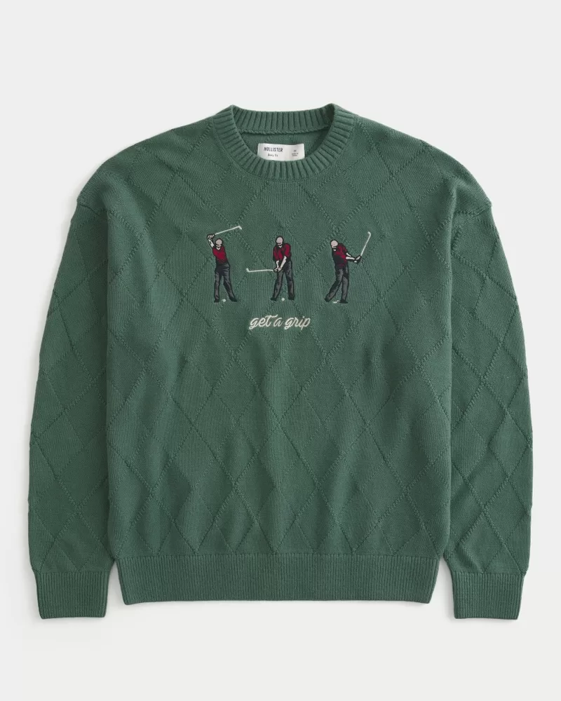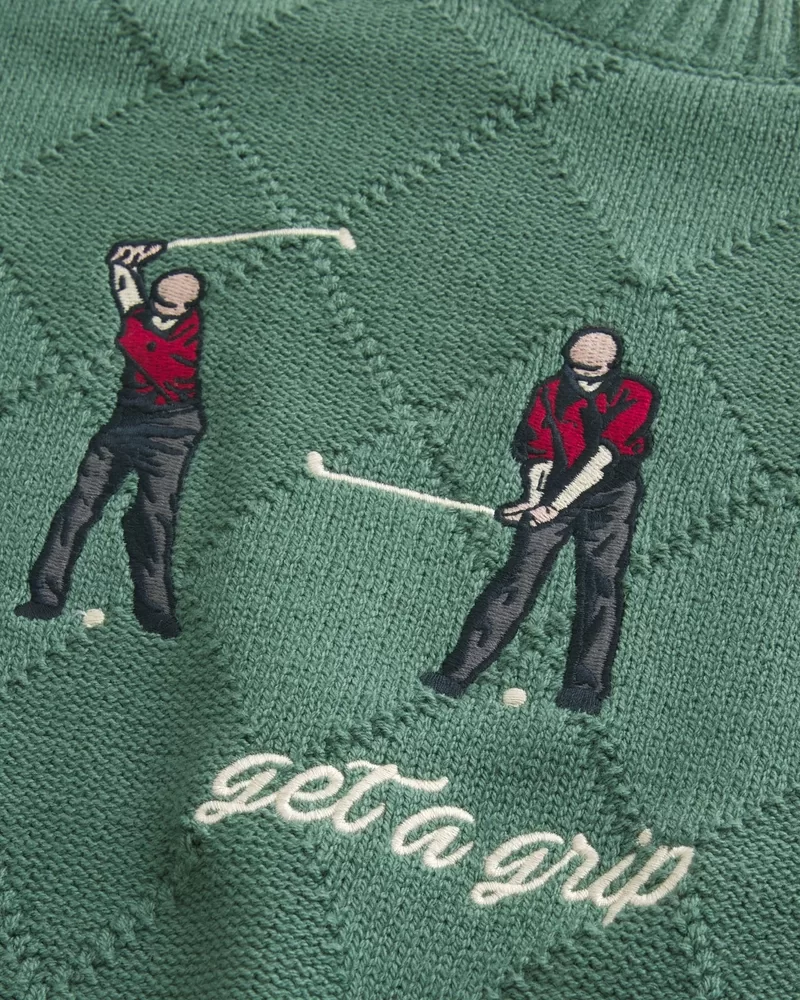 A super soft sweater featuring ‘get a grip’ statement graphic embroidery with golf swing details. Textured argyle pattern, crew neckline, long sleeves, ribbed trims. Boxy Fit. Imported.