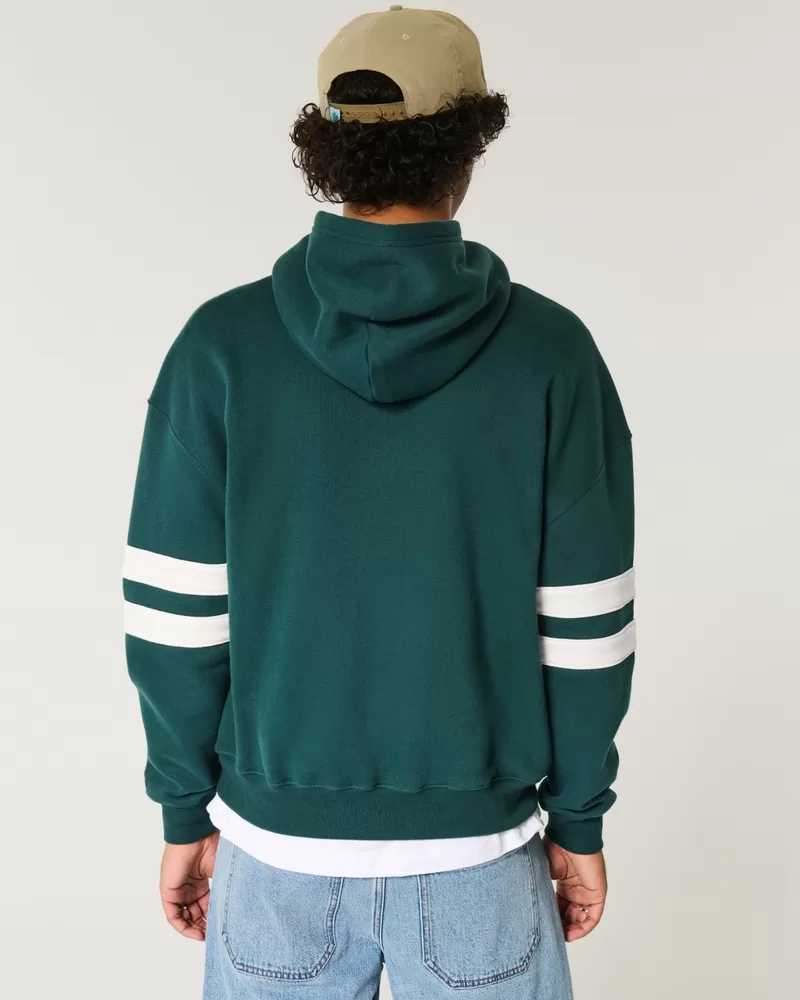 This super soft fleece hoodie has long sleeves and a front pouch pocket. Long sleeves with stripes, hood. Boxy Fit. Imported.