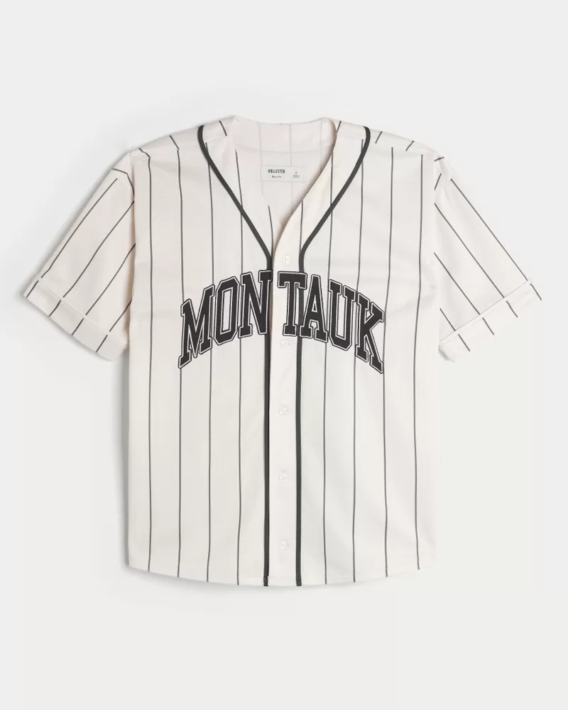 This classic baseball jersey features Montauk graphic embroidery and a full button closure. V-neckline, short sleeves, dimpled mesh fabric. Boxy Fit.