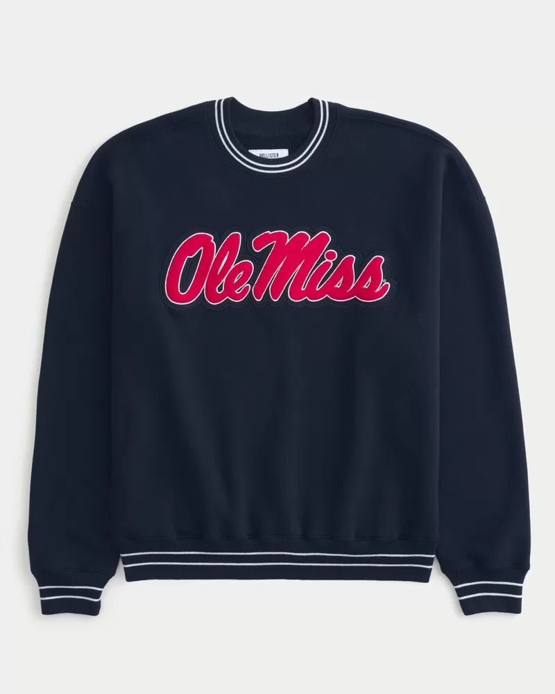 A super soft fleece sweatshirt featuring official licensed University of Mississippi Ole Miss graphic applique. Crew neckline, long sleeves, tipped trims. Boxy Fit.