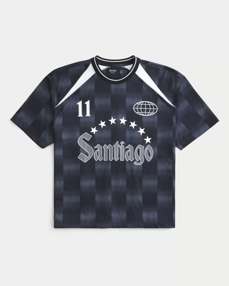 A classic soccer jersey featuring a Santiago print graphic at the front and number graphic at the back. Crew neckline, super soft and sporty fabric, short sleeves. Boxy Fit.