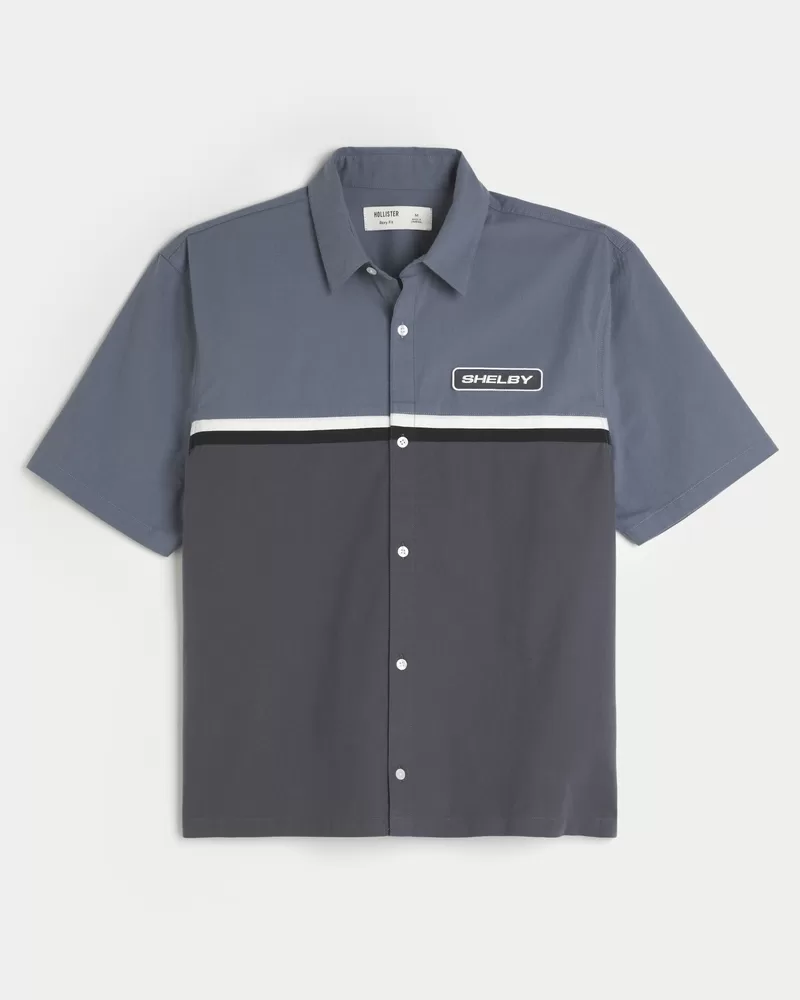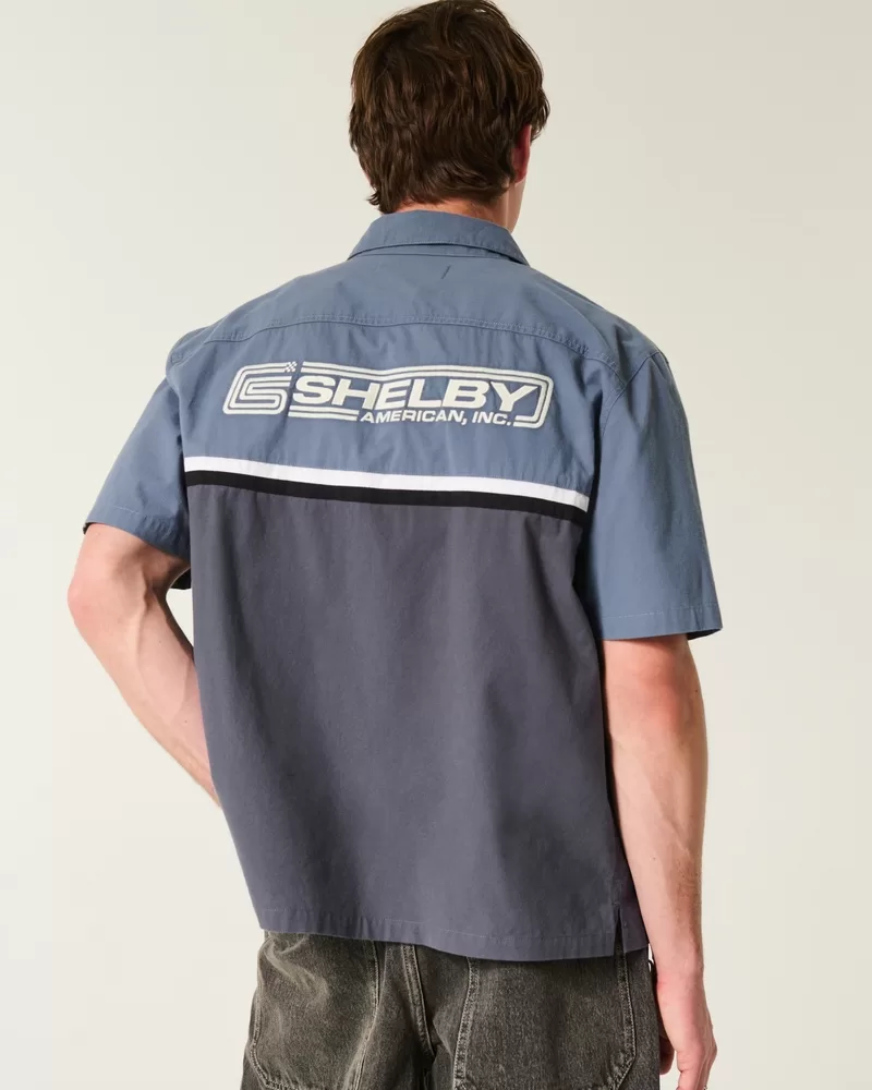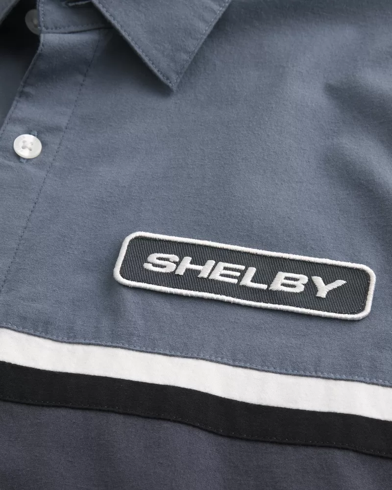 A classic workwear-style shirt featuring official licensed Shelby graphic embroidery at the left chest and back. Collar, short sleeves. Boxy Fit. Imported.