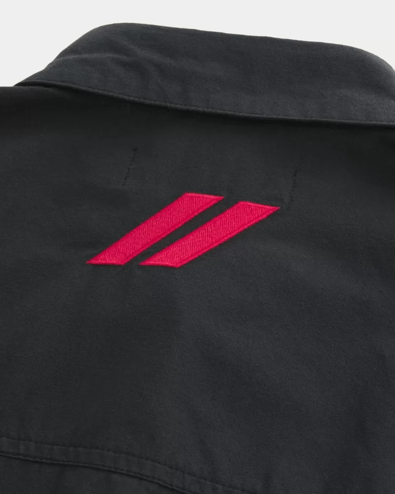 A classic workwear-style shirt with short sleeves and a full button closure. Official licensed Dodge Hellcat graphic embroidery at the front and back, collar, short sleeves. Boxy Fit.