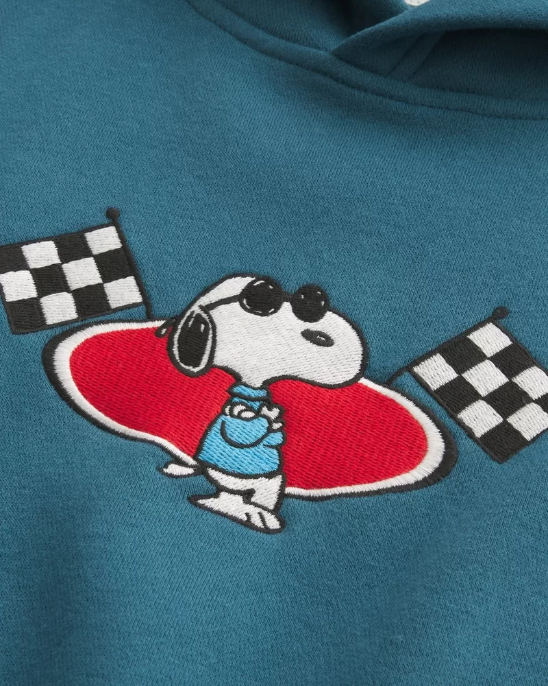 A super soft fleece hoodie featuring official Peanuts-licensed Snoopy graphic embroidery. Hood, front pouch pocket, long sleeves. Boxy Fit.