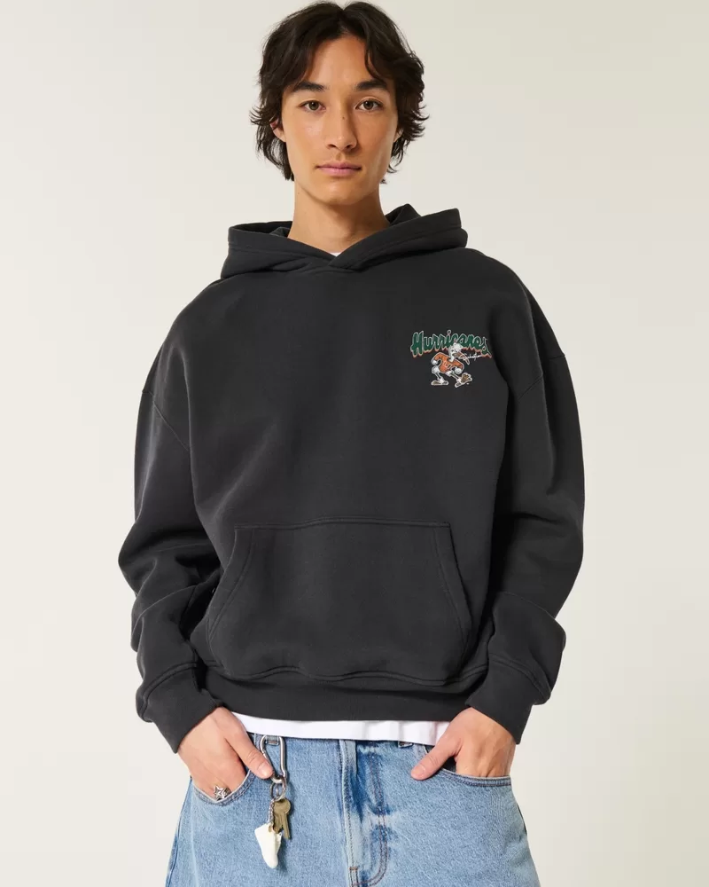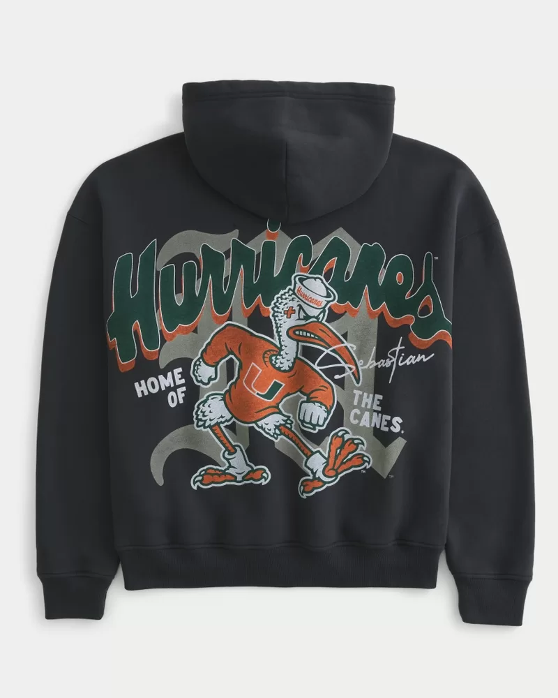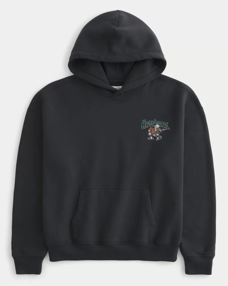 A super soft fleece hoodie featuring official licensed University of Miami Hurricanes print graphics at the left chest and back. Hood, front pouch pocket, long sleeves. Boxy Fit.