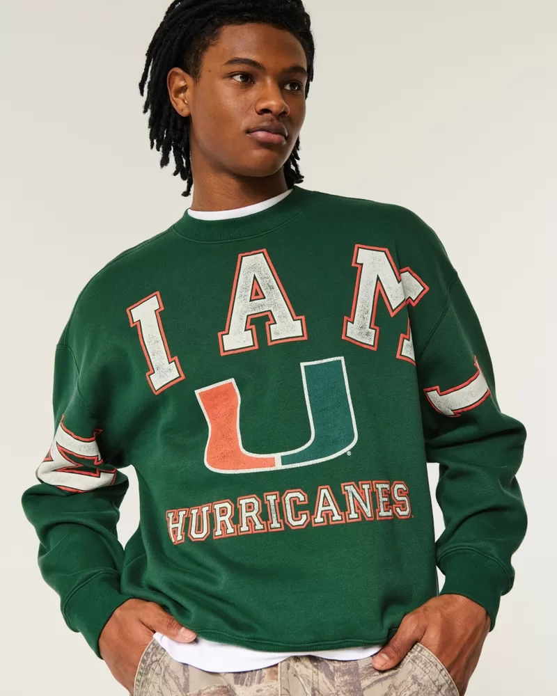 A super soft fleece sweatshirt featuring official licensed University of Miami Hurricanes print graphics. Crew neckline, long sleeves. Boxy Fit.