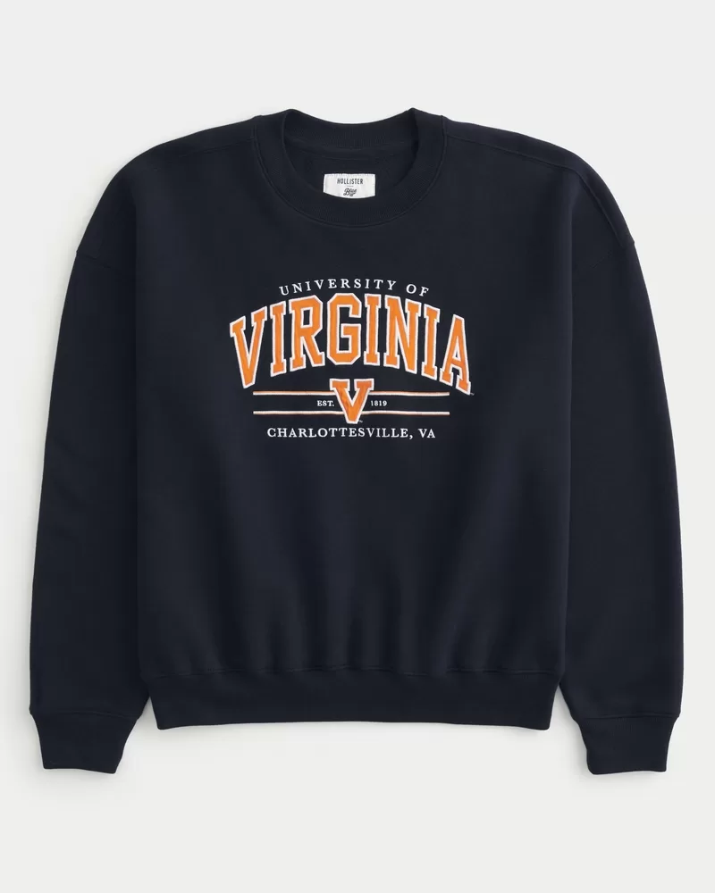 A super soft fleece sweatshirt featuring official licensed University of Virginia graphic applique and embroidery. Crew neckline, long sleeves. Boxy Fit.