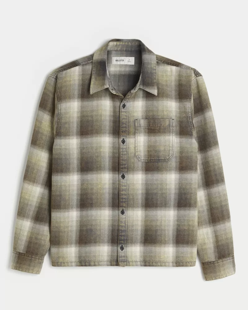 A super soft flannel overshirt with a full button closure and washed look. Collar, left chest pocket, long sleeves. Boxy Fit. Imported.