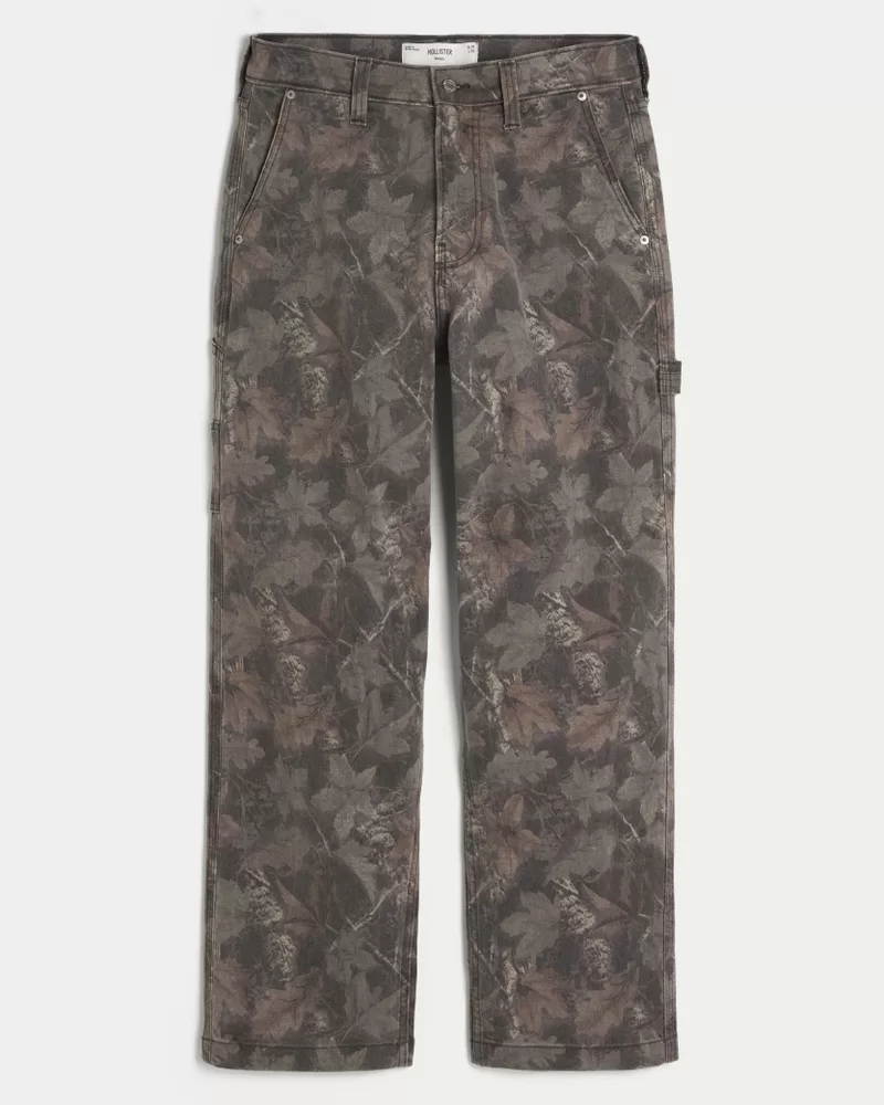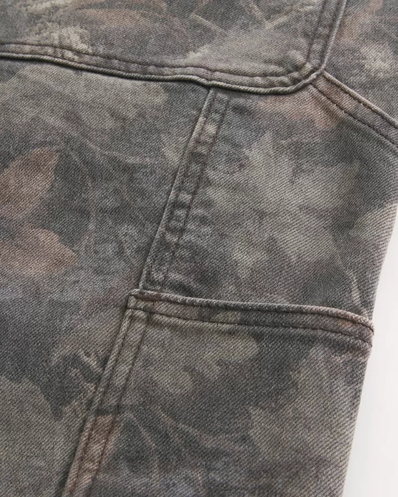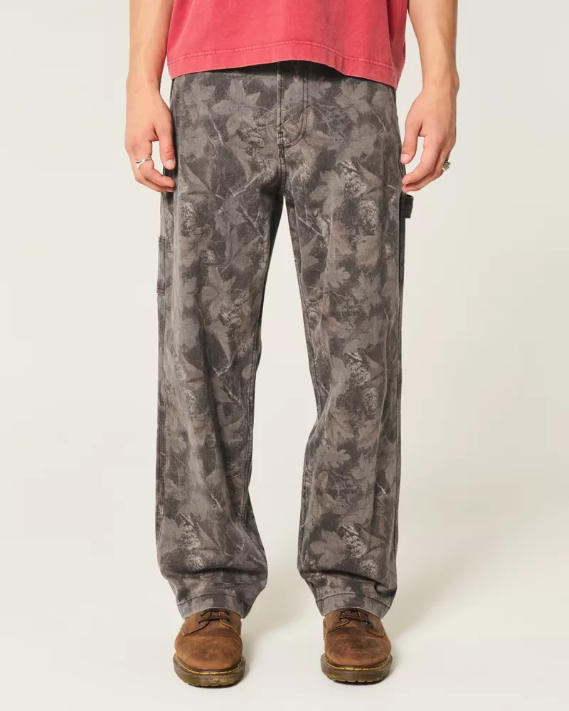 Comfortable denim jeans featuring an all-over camo pattern. Baggy leg, left loop detail, extra pockets.