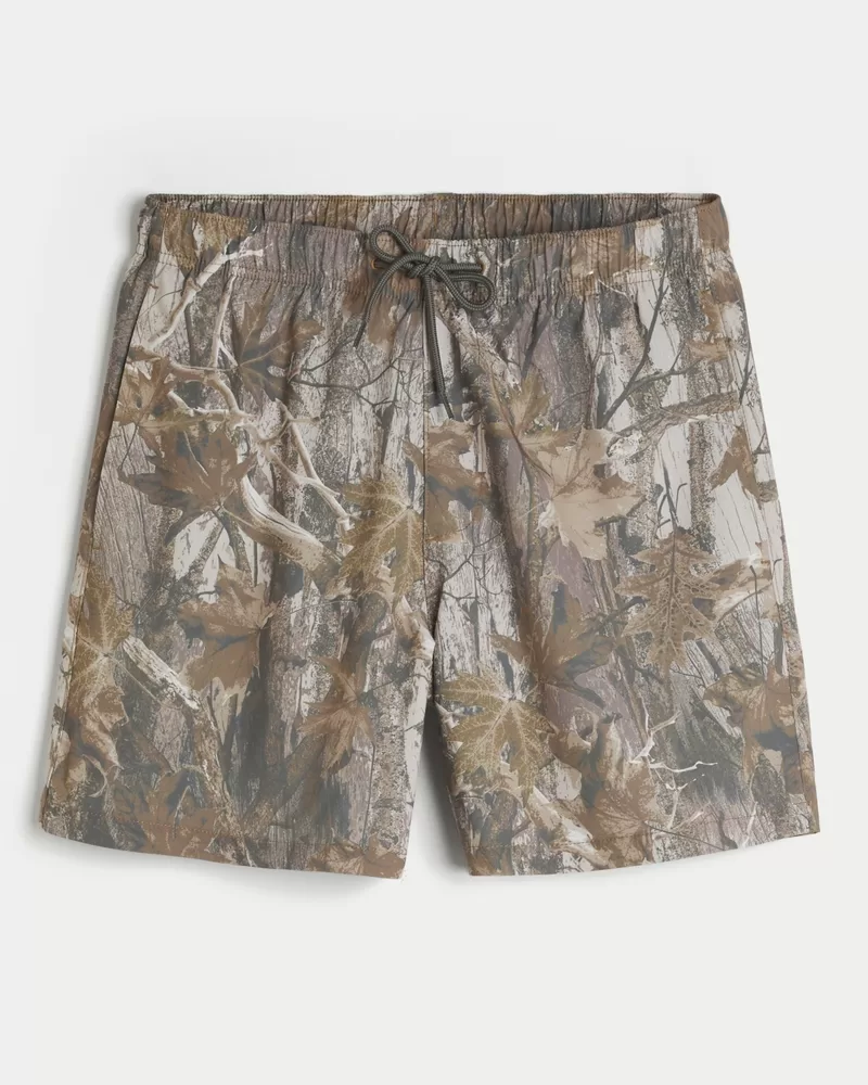 Shorter-length swim trunks that hit mid-thigh. Featuring comfortable 4-way stretch swim fabric and a 6″ inseam. Front pockets, mesh lining, all-over camo pattern. Imported.