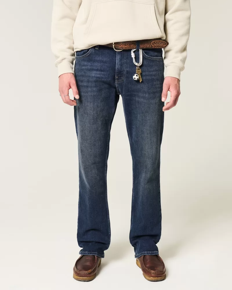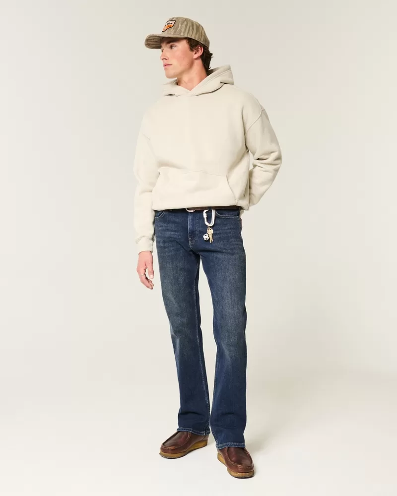 Comfortable denim jeans in a dark wash, designed with a slim leg and boot opening. Stretch, fading, whiskering.