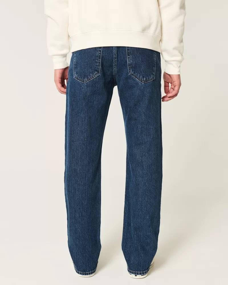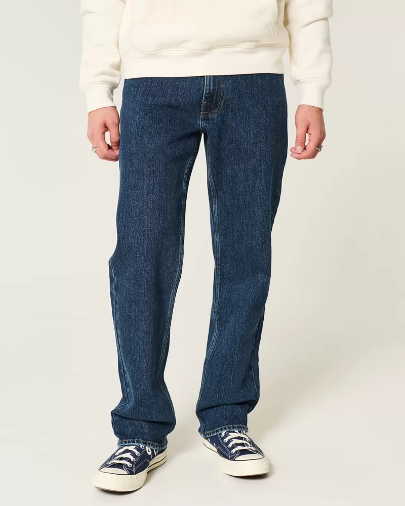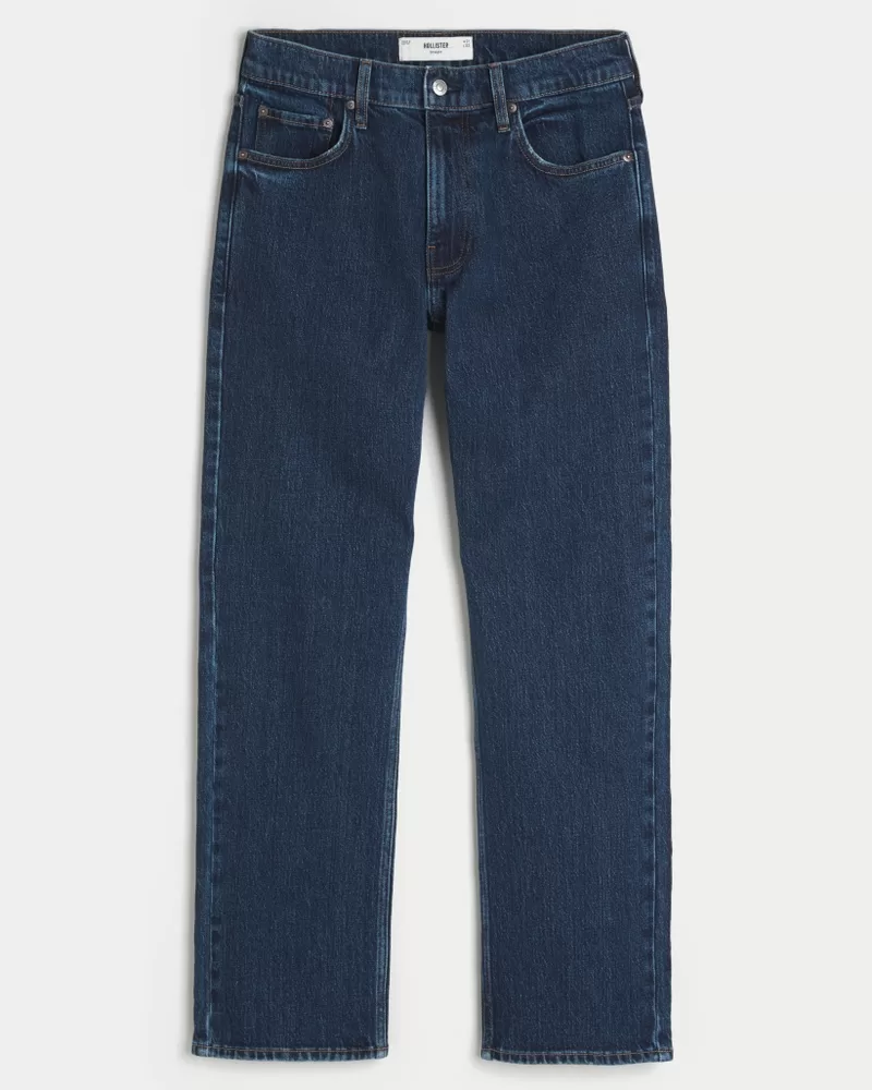 Comfortable denim jeans designed with a straight leg. Dark wash.