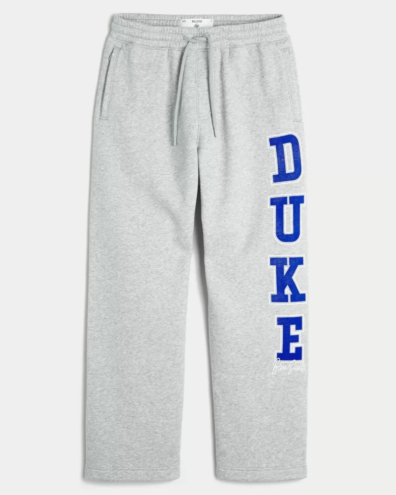 Super soft fleece sweatpants designed with a baggy leg, featuring official licensed Duke University Blue Devils print graphics. Drawstring waist, pockets, right zipper pocket.