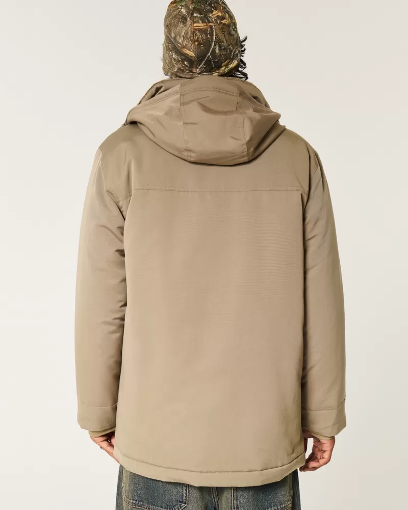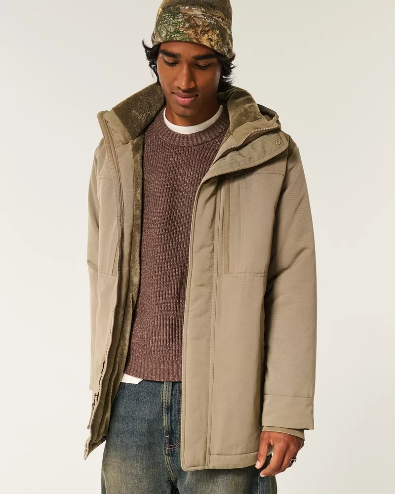 A classic parka with a full zip-up closure, hood, velcro cuffs, and dual entry front pockets. Super soft faux fur lining, mock neck collar, chest pockets.