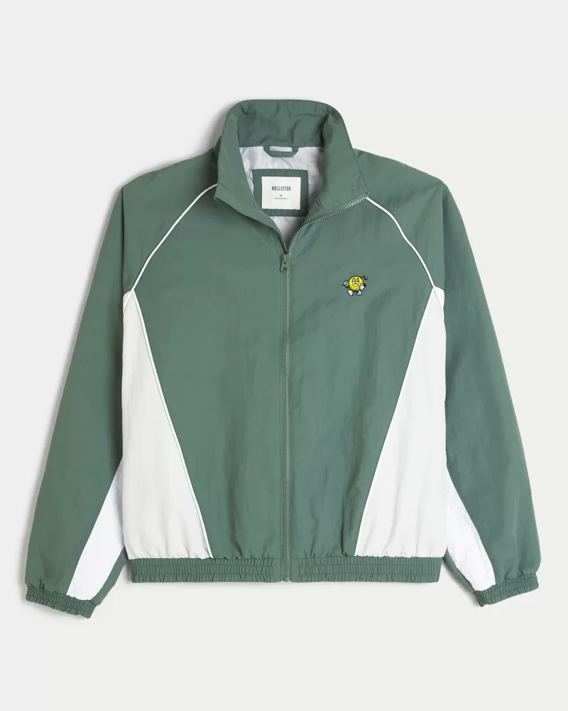 A classic windbreaker jacket with golf graphic embroidery at the left chest and back. Full zip-up closure, mock-neck collar, banded hems.