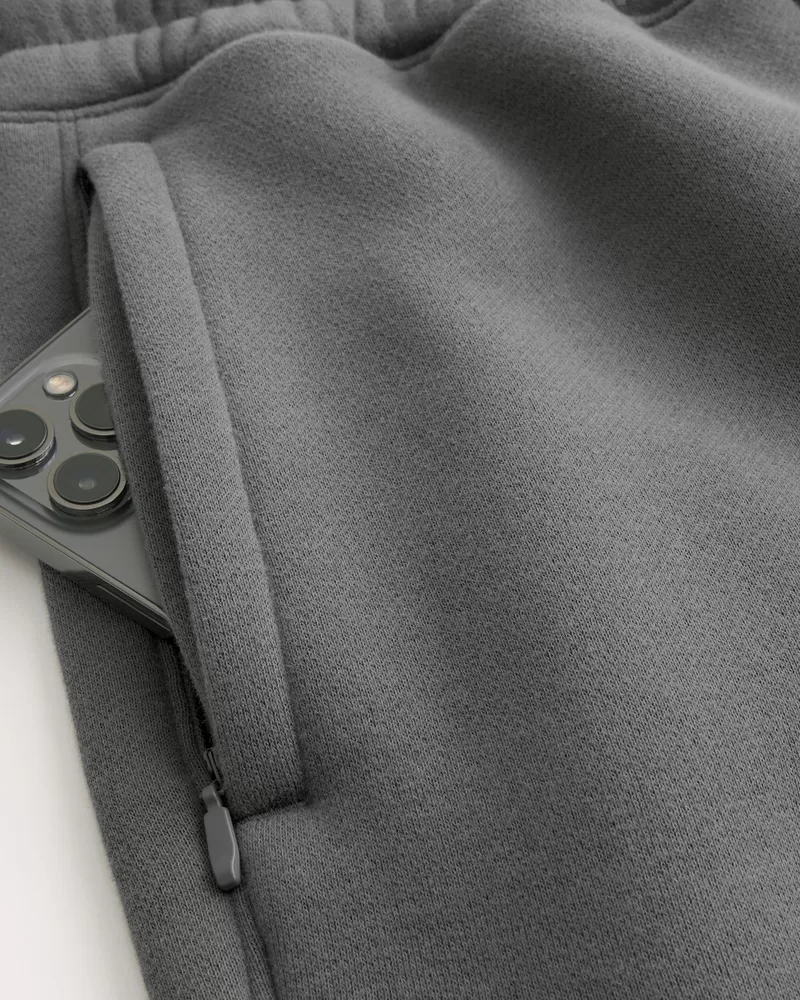 Super soft fleece joggers with a drawstring waist and banded hems. Embroidered logo icon near waist, pockets, right zipper pocket.