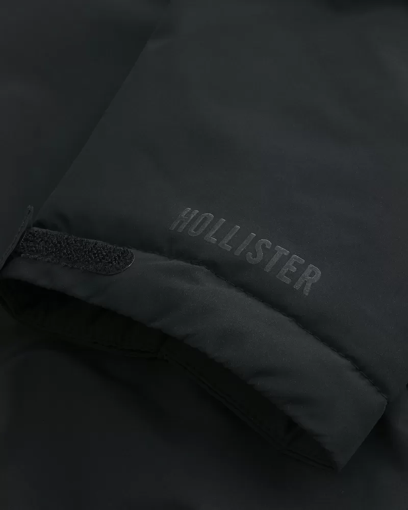 An insulated shell jacket with a hood, chest zipper pockets and front zipper pockets. Adjustable velcro cuffs, full zip-up closure with snaps.