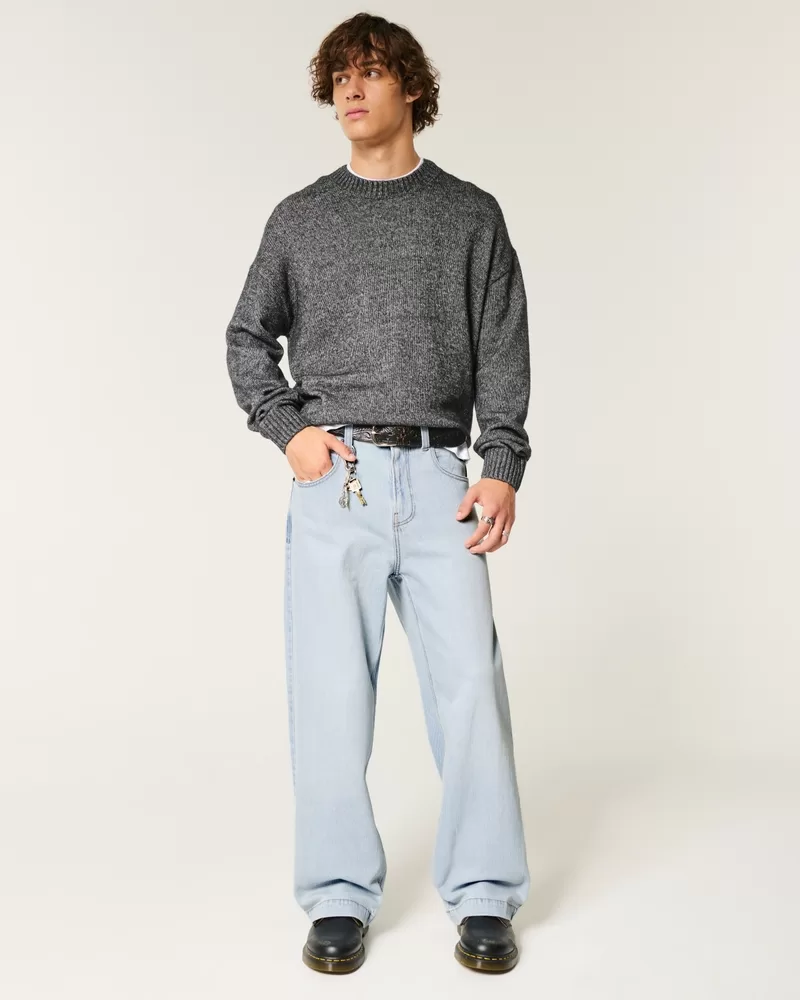 Ultra-comfortable jeans with stretch, designed with a super baggy leg. Playing cards graphic embroidery at the back pocket, light wash.