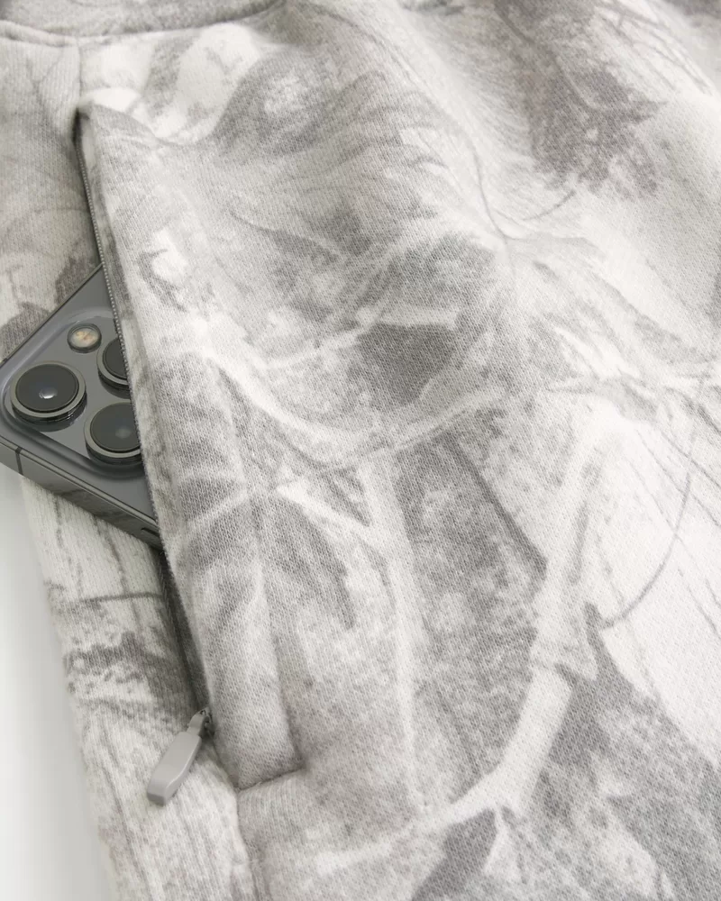 Super soft fleece shorts designed with a loose leg that hits mid-thigh. Drawstring waist, pockets, right zipper pocket, all-over camo pattern, embroidered logo detail at left hem.