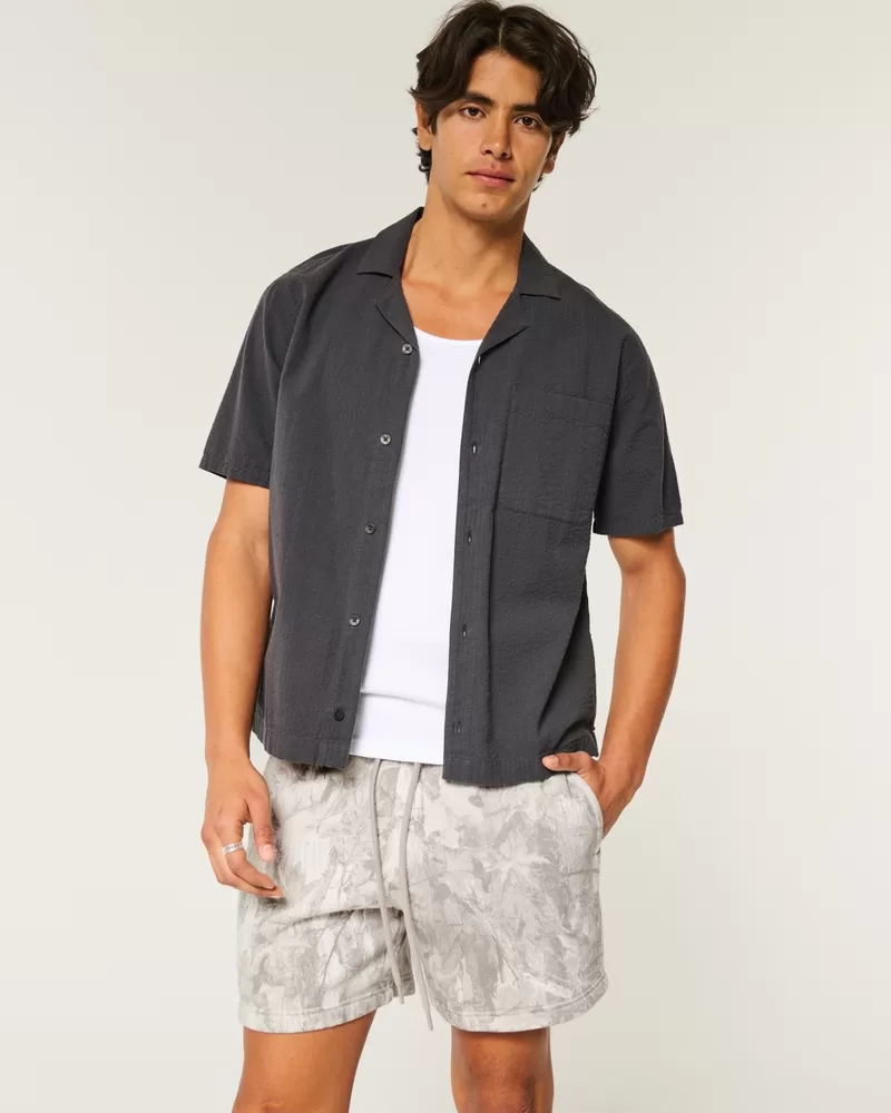 Super soft fleece shorts designed with a loose leg that hits mid-thigh. Drawstring waist, pockets, right zipper pocket, all-over camo pattern, embroidered logo detail at left hem. Imported.