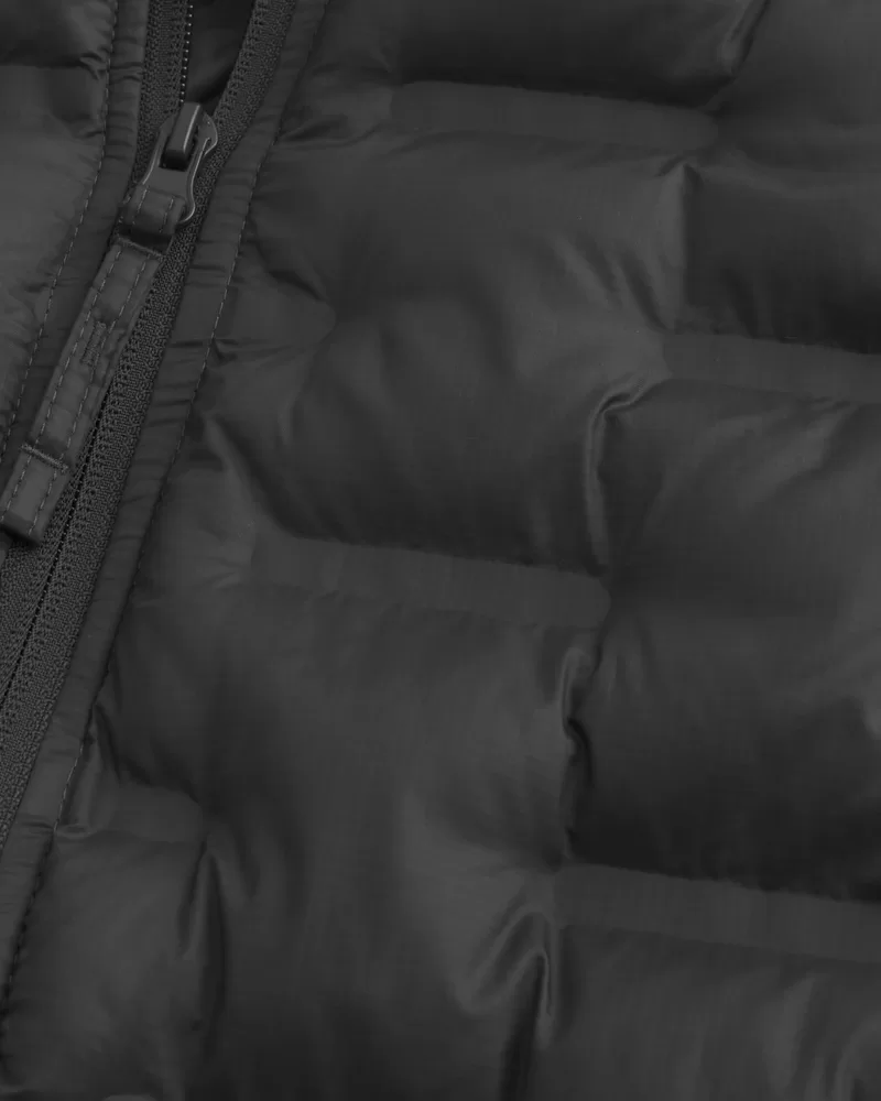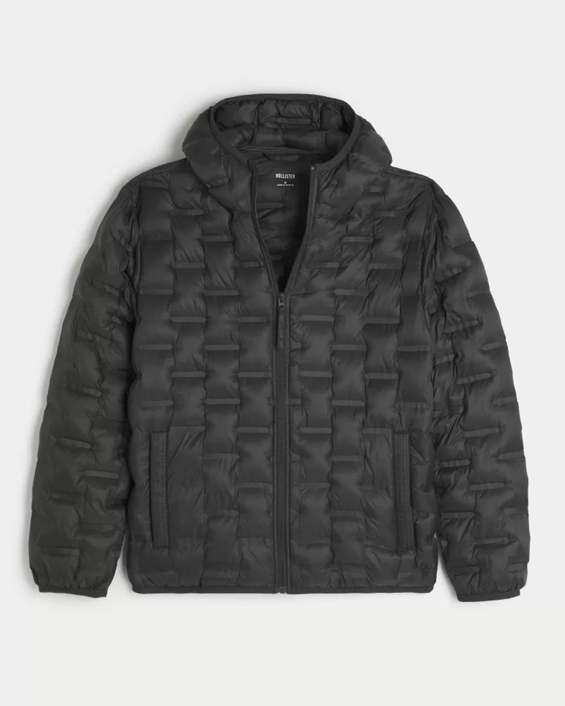 A midweight, nylon-lined puffer jacket designed with heat seal channels. Full zip-up closure, front pockets, hood.