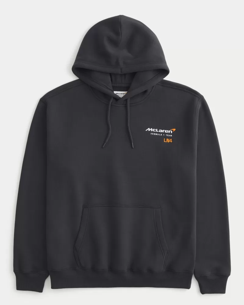 A super soft fleece hoodie featuring official licensed McLaren graphic embroidery at the left chest and Lando Norris print graphics at the back. Drawstring hood, front pouch pocket, long sleeves. Relaxed Fit. Imported.