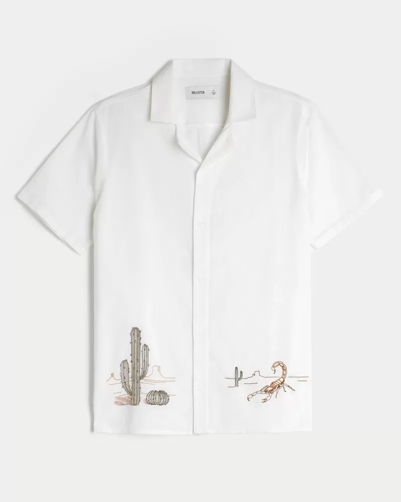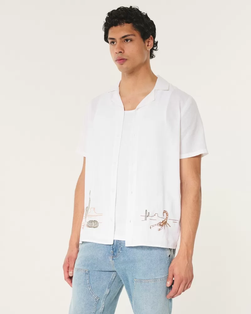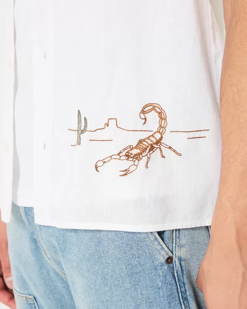 This classic shirt features western-inspired graphic embroidery, a full button closure, collar and short sleeves. Relaxed Fit.