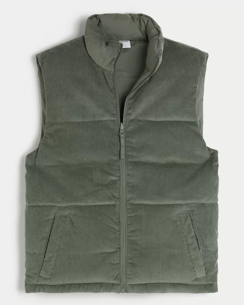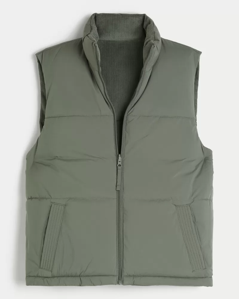 A reversible vest with one corduroy side and one solid side. Quilted channels, mock-neck collar, pockets, full zip-up closure.