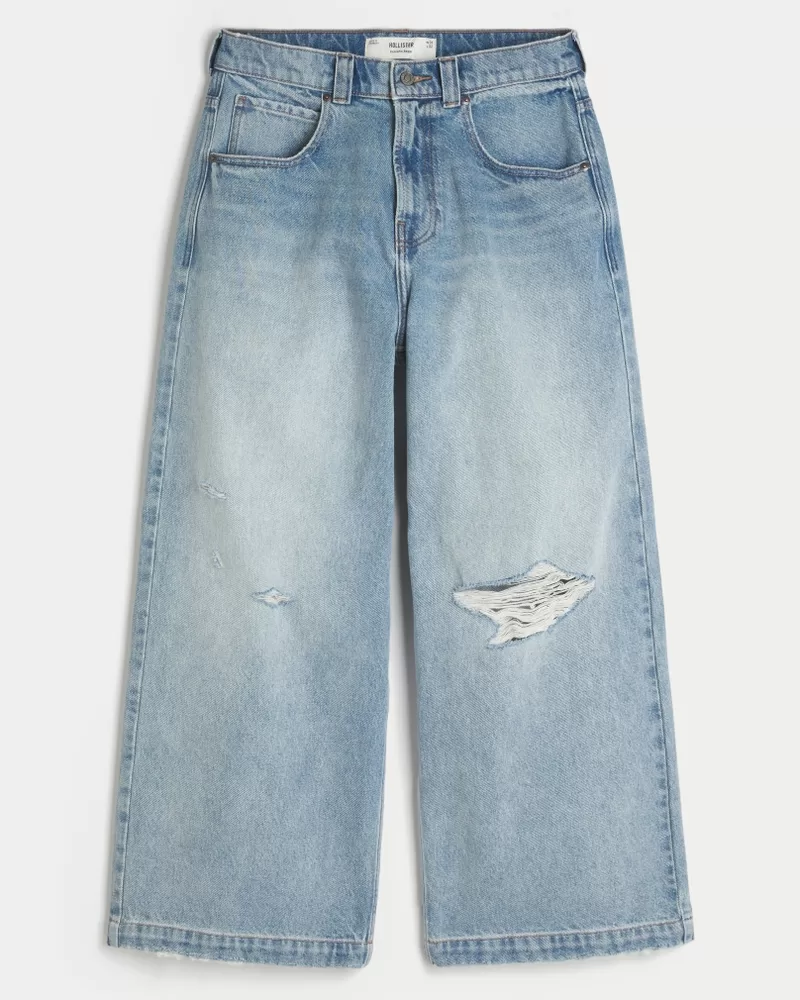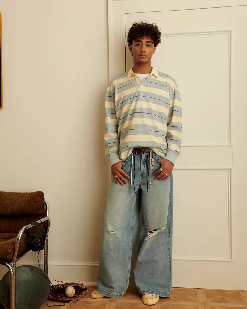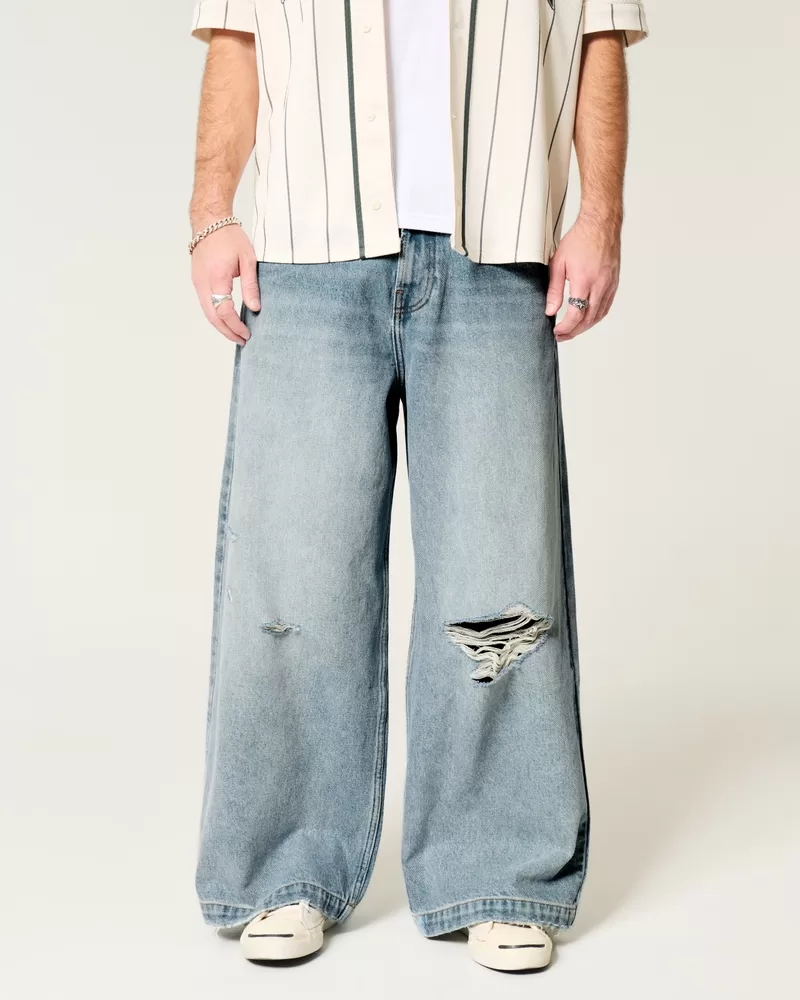 Comfortable jeans designed with an extreme baggy leg. Light wash denim with fading, whiskering and ripped details. Imported.