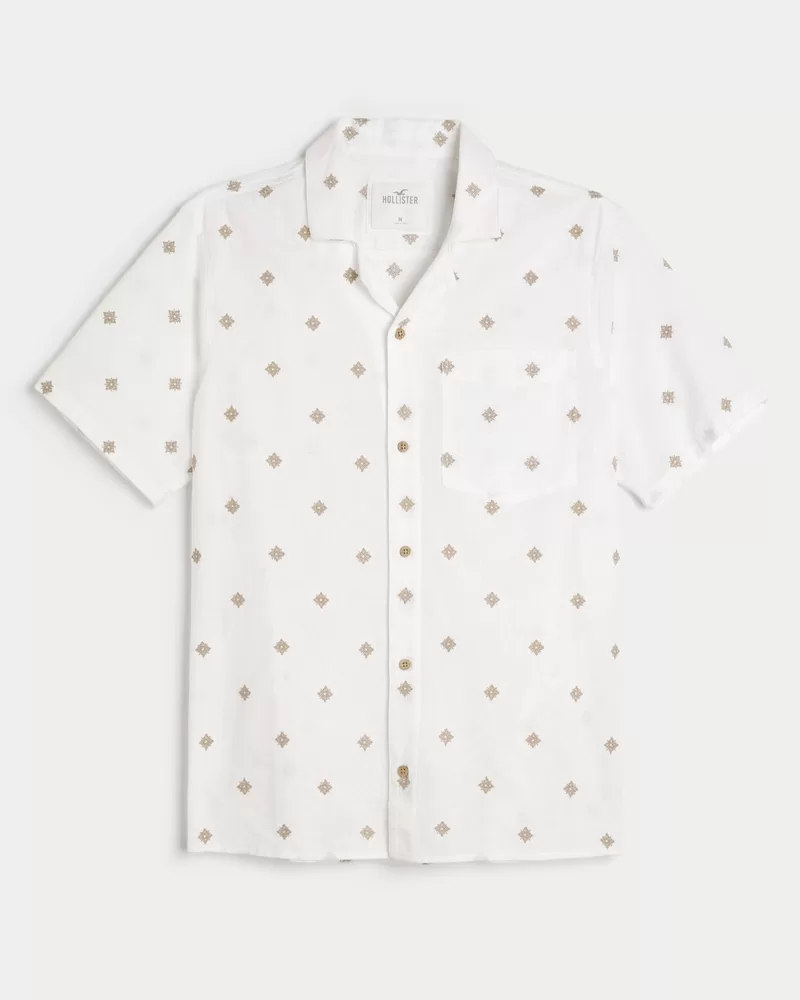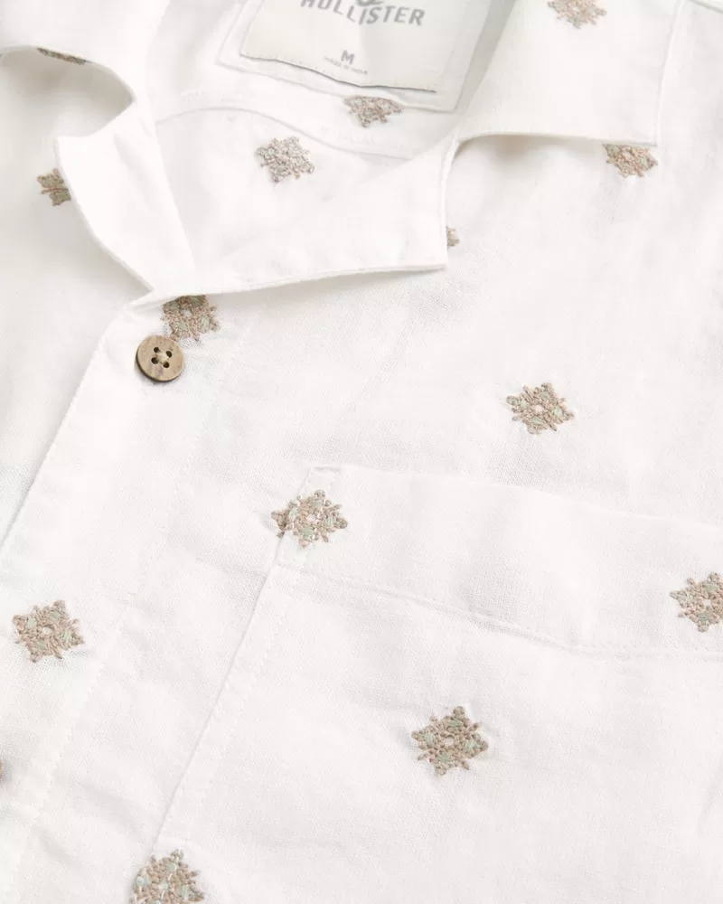 Comfortable and super soft, this shirt features a button-through closure, camp collar, left chest pocket and short sleeves. All-over embroidered pattern, soft linen-blend fabric. Relaxed Fit.