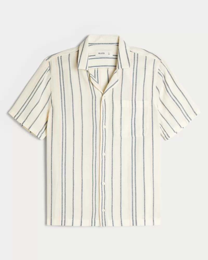 A classic button-through shirt in soft textural fabric with stripes. Collar, short sleeves, left chest pocket. Imported.