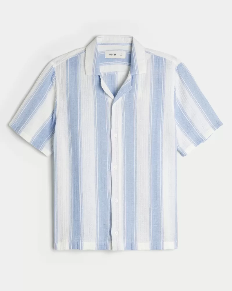 A classic button-through shirt in soft textural fabric with stripes. Collar, short sleeves, left chest pocket.
