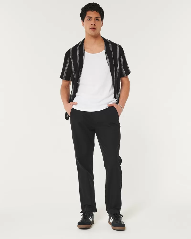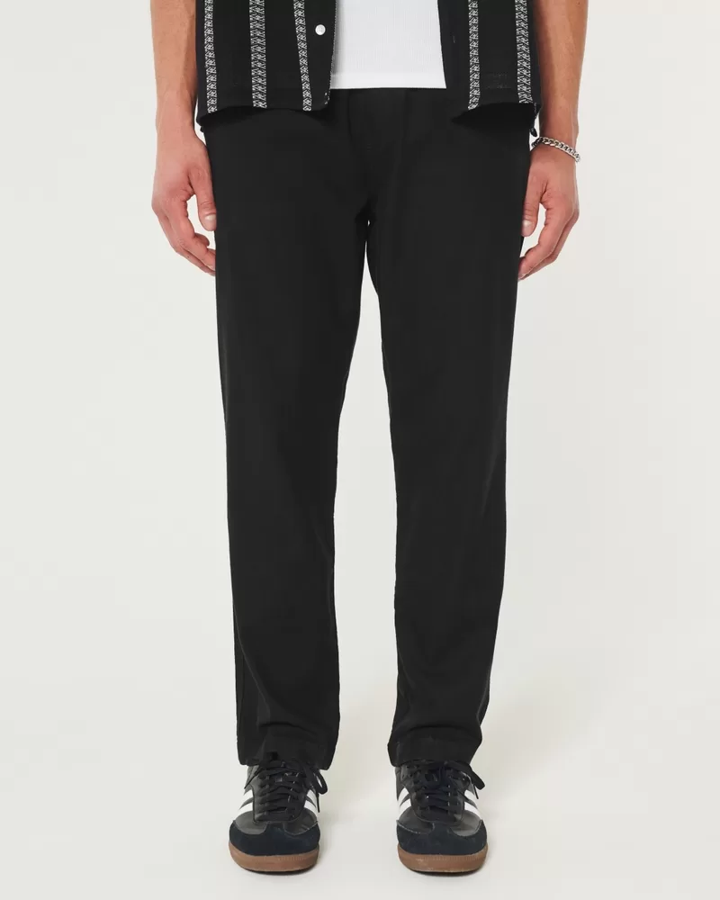 Ultra-comfortable pants in a soft linen blend with Hollister Epic Flex, designed with a slim straight leg. Drawstring waist, pockets, right zipper pocket.