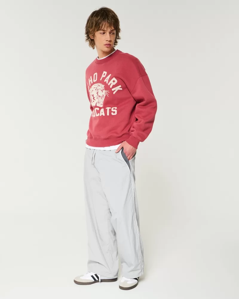 Comfortable track pants with a drawstring waist and side piping. Pockets, super baggy leg. Imported.